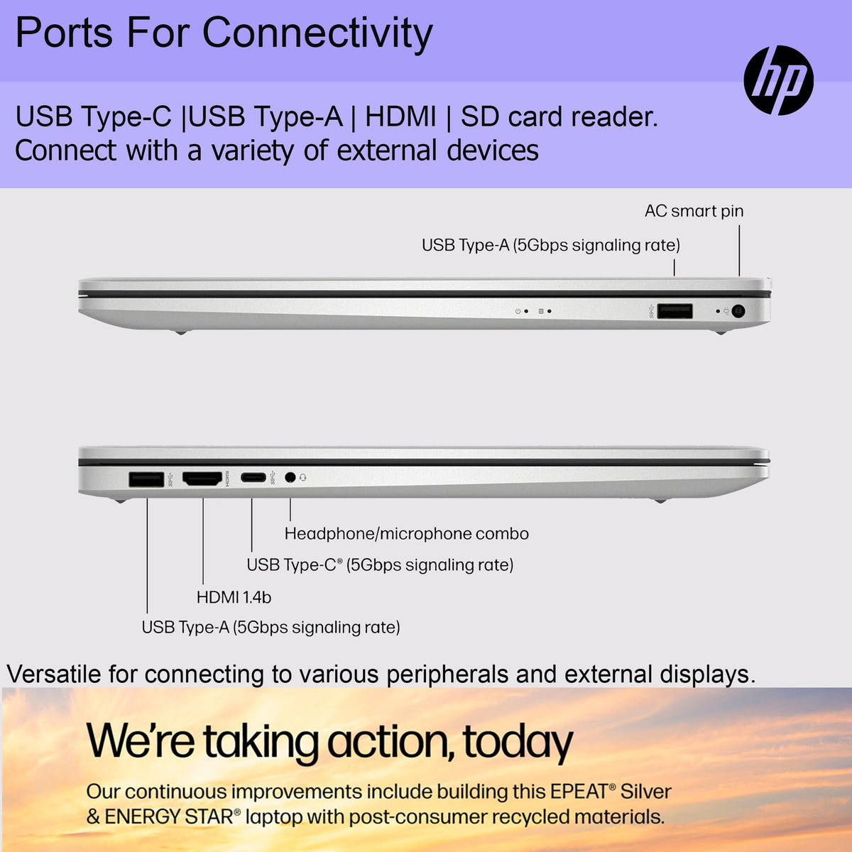 Processor: Intel Core I3-1215U Graphics: Integrated Operating System: Windows 11 Memory:&Nbsp;12Gb Ddr4 Sdram Hard Drive:&Nbsp;1Tb&Nbsp;Pcie Ssd Display:&Nbsp;17.3'' Diagonal, Fhd (1920 X 1080) Keyboard:&Nbsp;Us English, Full Size Keyboard With Numeric Keypad Ports:&Nbsp; 1 X Usb 2.0(Usb Type-C 5Gbps Signaling Rate) 2 X Usb Type-A Port (5Gbps Signaling Rate) 1 X Headphone / Mic Combo Jack 1 X Hdmi Connectivity:&Nbsp;Wifi And Bluetooth Color:&Nbsp;Silver Dimensions L X W X H (Inches):&Nbsp;16.8 X&Nbsp;12.1 X&Nbsp;2.0 Inches Weight:&Nbsp;4 Lbs