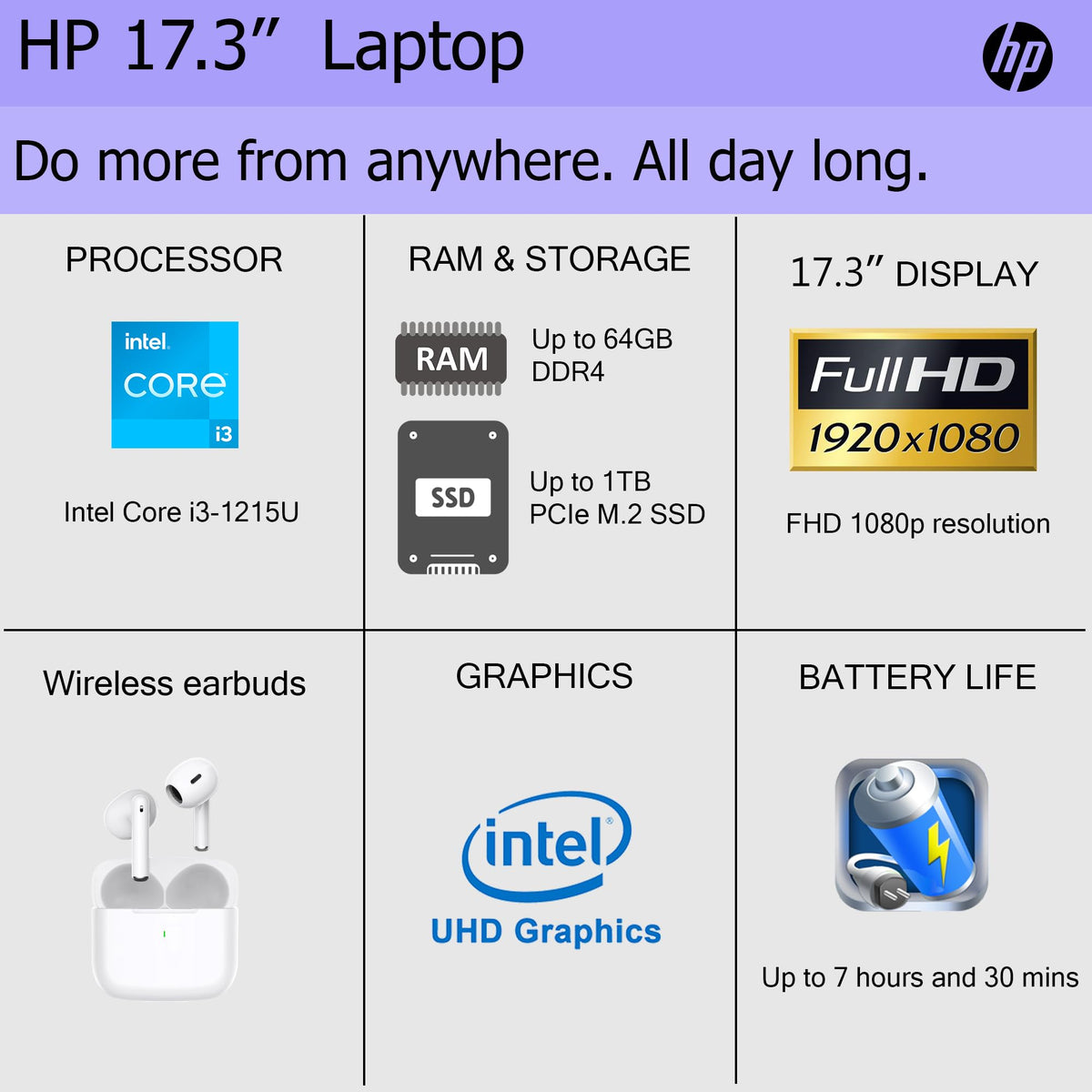 Hp 17.3'' Laptop With Wireless Earbuds, Full Hd Display, 32Gb Ram, 1.5Tb Storage(1Tb Ssd Onboard+ 500Gb External Drive), Intel 6