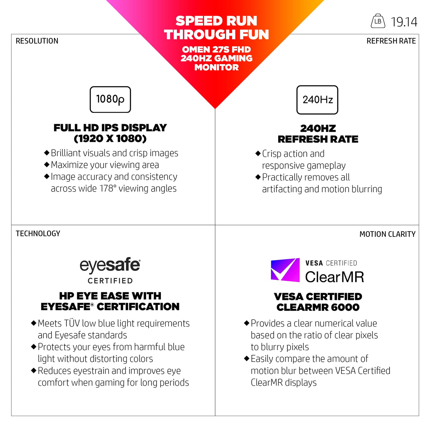 Speed Run Through Fun With The Omen 27S Fhd 240Hz Gaming Monitor. Outclass The Competition With Ultra-Smooth Frames And Crisp Details, This Nvidia G-Sync Compatible Display Has What It Takes To Keep Up With You. With A Refined Design Unlike Any Other. This Monitor Comes With A Power Cord, Displayport 1.4 Cable, Usb 3.0 A-B Cable And A Quick Setup Poster. Plus, This Display'S Plastics Contain 85% Post-Consumer Recycled Plastics To Help Reduce The Raw Materials We Use. This Monitor Is Protected By A 1-Year Hp Limited Warranty. Certain Restrictions And Exclusions Apply. Recycled Plastic Content Percentage Is Based On The Definition Set In The Ieee 1680.1-2018 Epeat Standard.