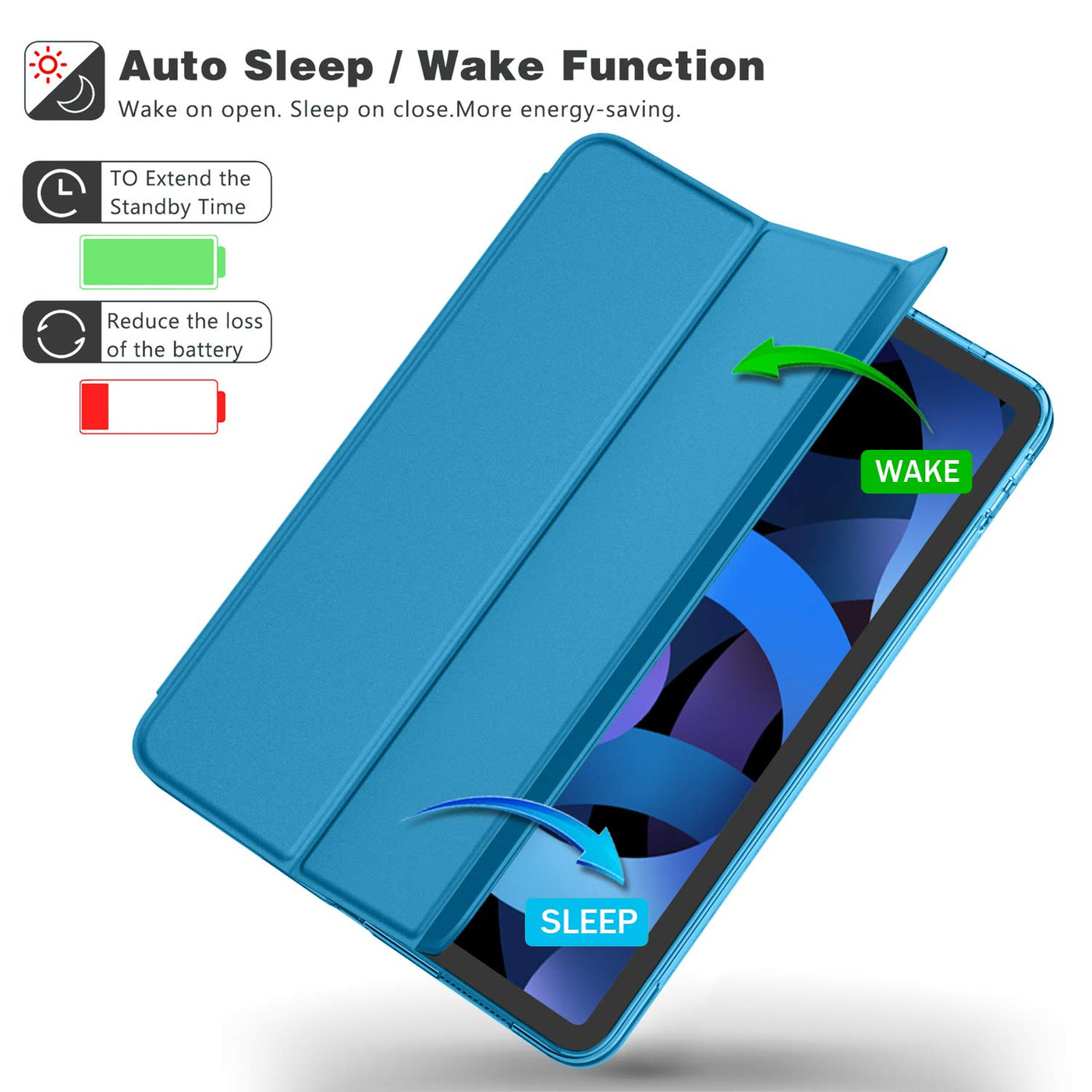 Q: How does the auto wake/sleep feature work with this case?A: The case has a built-in magnetic strip that automatically wakes your iPad Air when the lid is opened and puts it to sleep when closed, which helps to protect and extend your device's battery life.