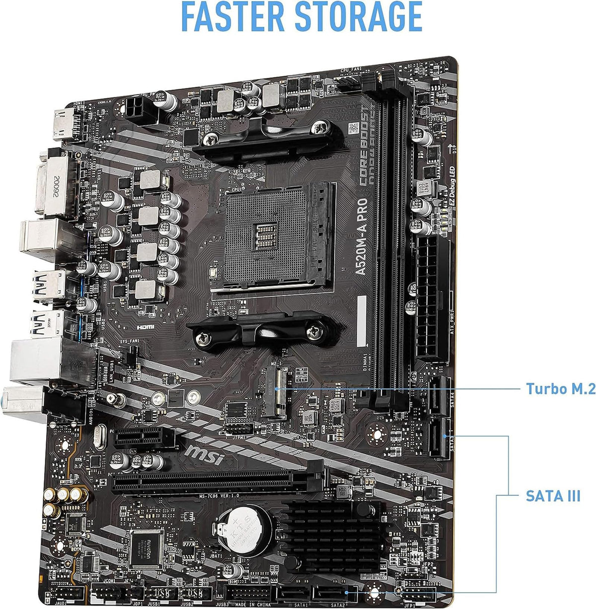 Msi A520M-A Pro Gaming Motherboard & Amd Ryzen 5 4500 Cpu Processor Combo What'S Included In The Box: Msi A520M-A Pro Gaming Motherboard Manufacturer Features Form Factor: Atx Cpu Socket Type: Am4 Supports Amd Ryzen 5000 & 3000 & 4000 G-Series Desktop Processors Memory Type: Support Dual Memory Channel Up To 128Gb Storage: 1 X M.2 Pcie 3.0X4 Slot (Key M), 4X Sata 6Gb/S Ports, Usb 3.2 Gen 1 Manufacturer Features: Turbo M.2, Core Boost, Ddr4 Boost, 2Oz Thickened Copper Pcb, Audio Boost, Dragon Center. Amd Ryzen 5 4500 Cpu Processor Specifications Unlocked & Overclockable: Yes Base Clock Speed (Ghz): 3.6 Ghz Max Boost Clock: Up To 4.1 Ghz Cores/Threads: 6/ 12 Cache (L2+L3): 11 Mb Tdp: 65 W Cpu Socket: Am4 Memory Support: Ddr4-3200 Pci Express Version: Pcie 3.0 Socket Support: Am4 On Amd 500 Series Mb Os Support: Windows 10/ 11- 64-Bit Edition Unlocked & Unleashed The World'S Advanced Processor Amd Ryzen 5 4500 Cpu Processor Can Deliver Ultra-Fast 100+ Fps Performance In The World'S Most Popular Games. 6 Cores And 12 Processing Threads, Bundle With Msi A520M-A Pro Gaming Motherboard. Experience Elite Performance In Games, Content Creation, And Intense Multi-Tasking. A Beautifully Balanced Design For Serious Pc Enthusiasts.