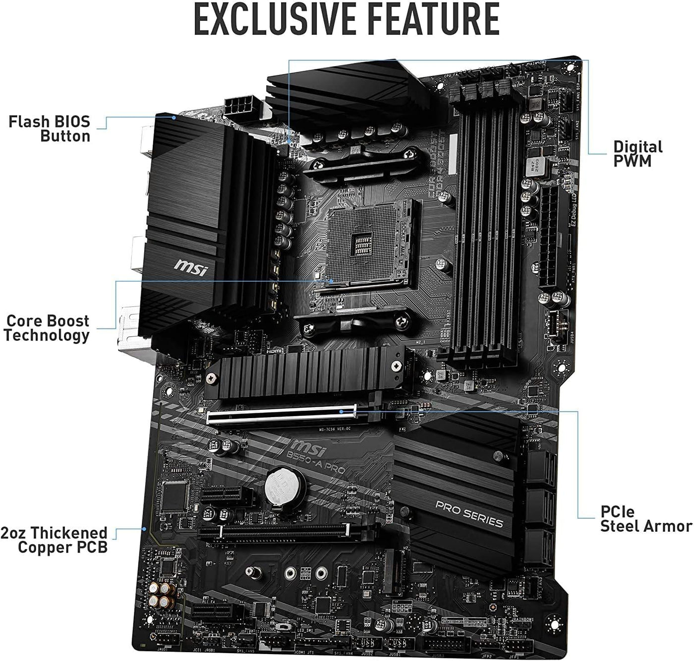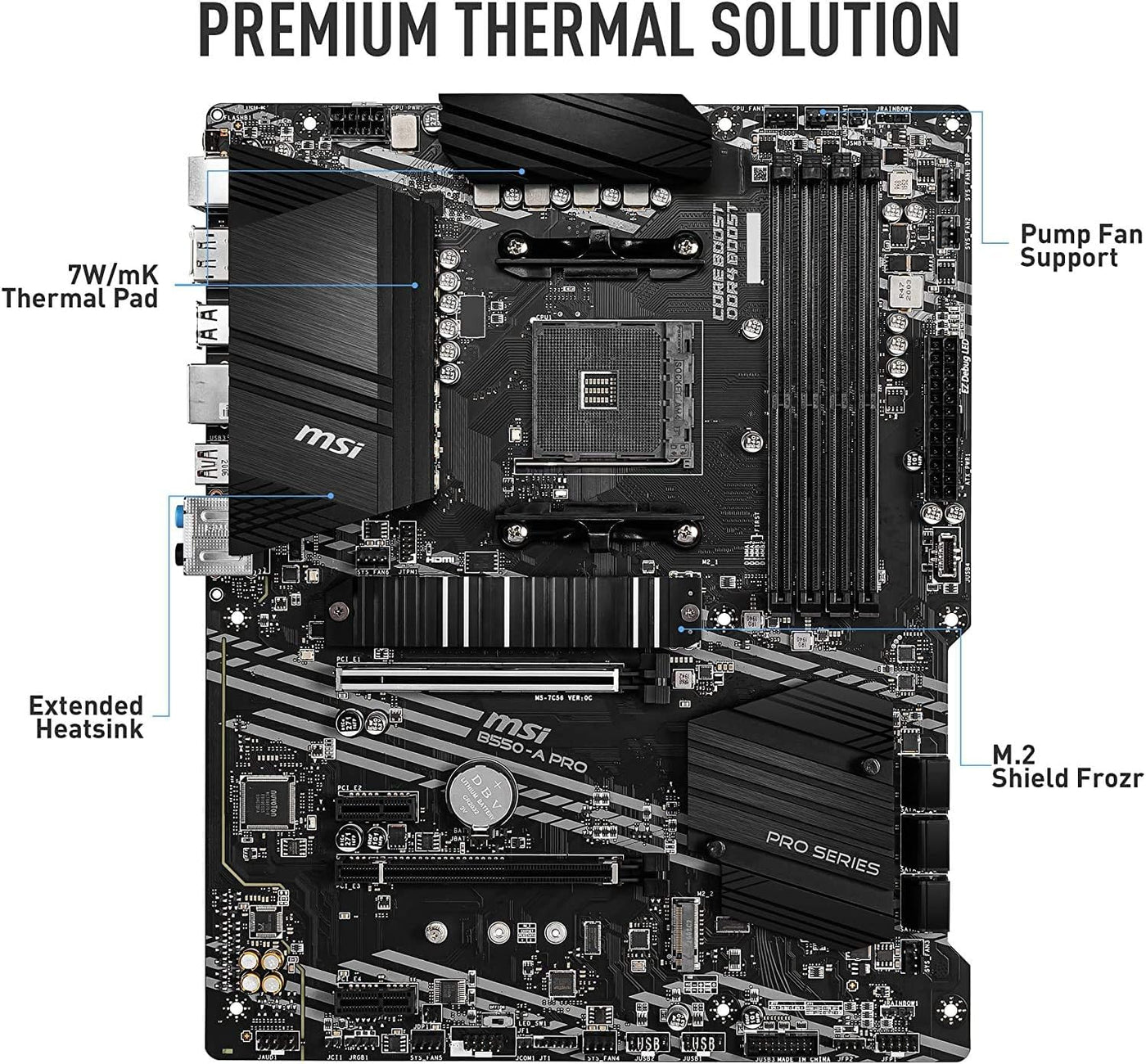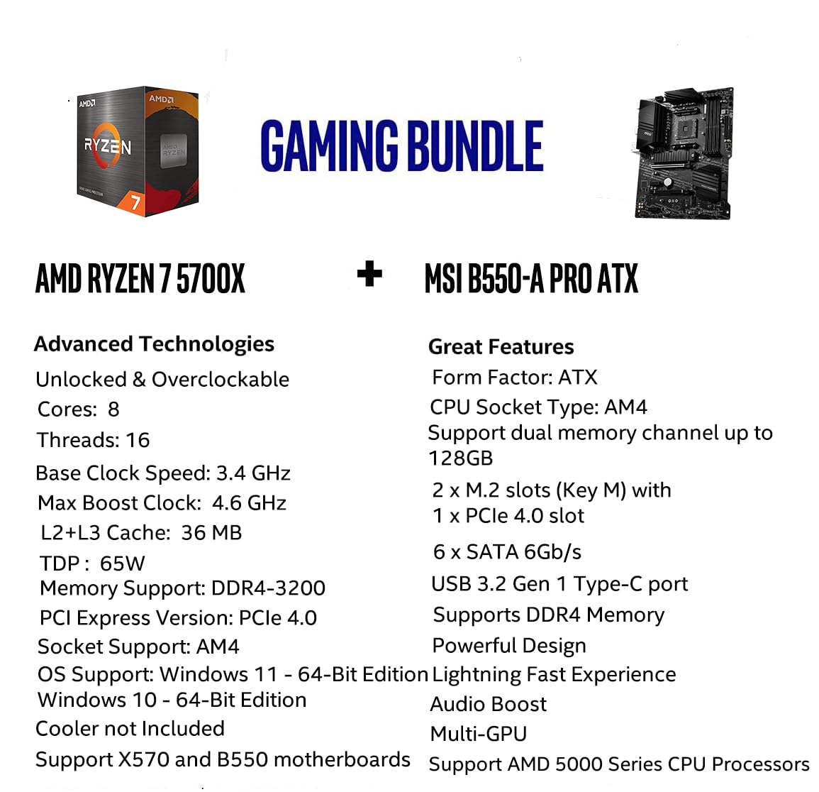Amd Ryzen 7 5700X Desktop Processor 8 Cores And 16 Processing Threads, Based On Amd ''Zen 3'' Architecture,4.6 Ghz Max Boost, Unlocked For Overclocking, 36 Mb Cache, Ddr4-3200 Support,Cooler Not Included | Can Deliver Ultra-Fast 100+ Fps Performance In The World'S Most Popular Games, Discrete Graphics Card Required,For The Advanced Socket Am4 Platform, Can Support Pcie 4.0 On X570 And B550 Motherboards | Msi B550-A Pro Motherboard:Supports Amd Ryzen 5000 & 3000 Series Desktop Processors (Not Compatible With Amd Ryzen 5 3400G & Ryzen 3 3200G) And Amd Ryzen 4000 G-Series Desktop Processors | Supports Ddr4 Memory, Up To 4400(Oc) Mhz,Lightning Fast Experience: Pcie 4.0, Lightning Gen4 X4?M.2 With M.2 Shield Frozr, Amd Turbo Usb 3.2?Gen?2,Powerful Design: Core Boost, Digital Pwm Ic, 2Oz Thickened Copper Pcb, Creator Genie, Ddr4 Boost | Premium Thermal Solution: Extended Heatsink Design?With Additional Choke Thermal Pad?And 7W/Mk Pad, And?M.2 Shield Frozr Are Built For High Performance System And Non-Stop Works,Audio Boost: Reward Your Ears With Studio Grade Sound Quality