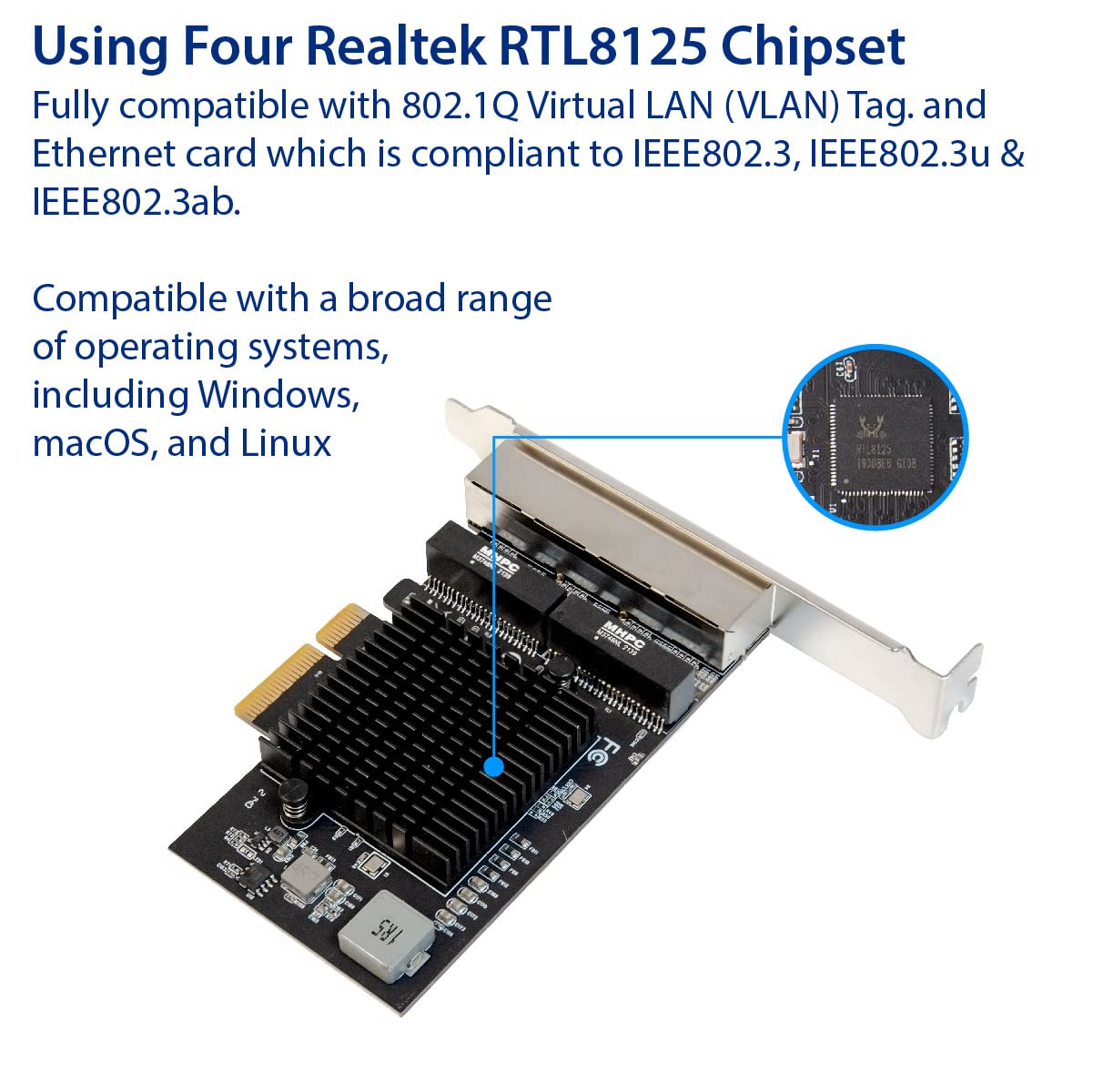 Io Crest Quad 2.5 Gigabit Ethernet Pci Express Pci E Network Interface Card 10/100/1000/25000 Mbps Rj45 Lan Realtek Rtl8125 Chip