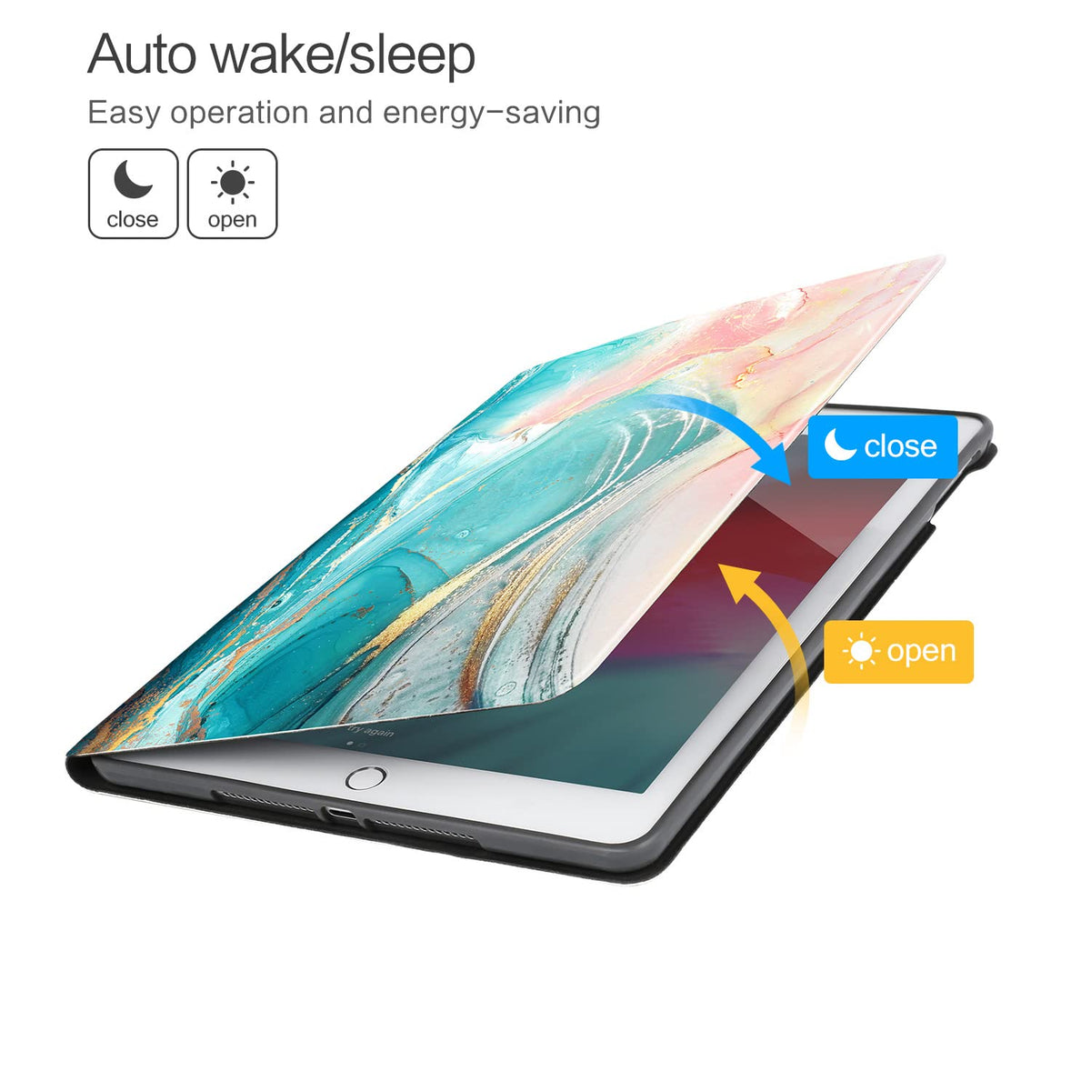 Q: How does the auto sleep/wake function work?A: The case is equipped with built-in magnets that ensure the auto sleep/wake function activates quickly when you open or close the cover, helping to extend your iPad’s battery life.