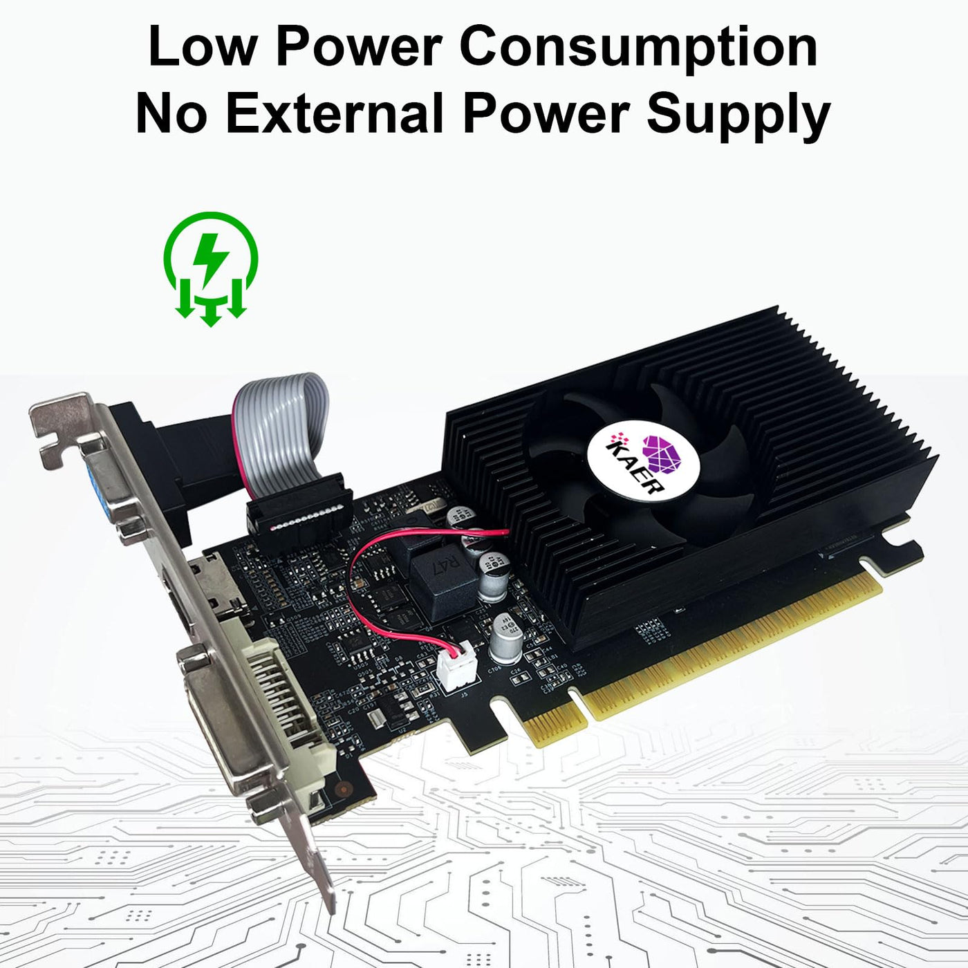 Q: What are the power requirements for the KAER GT 730?A: The KAER GT 730 requires a 300-watt power supply and has a maximum power consumption of only 65 watts. It does not require an external power connector, making it an energy-efficient option for budget builds.