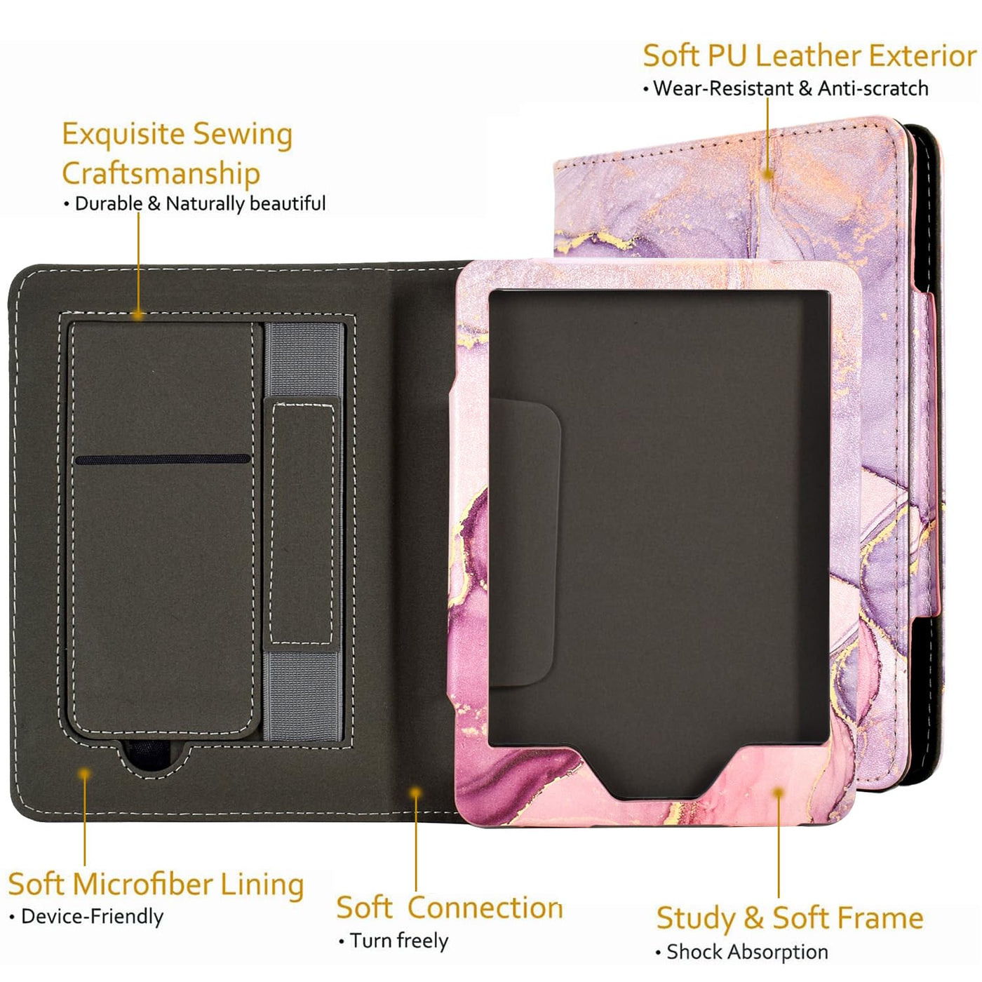 Q: What materials are used in the KEROM Kindle Paperwhite Case?A: The KEROM Kindle Paperwhite Case is made of high-quality PU synthetic leather with a soft microfiber interior. This combination offers durability while protecting your device from scratches, bumps, and everyday damage.