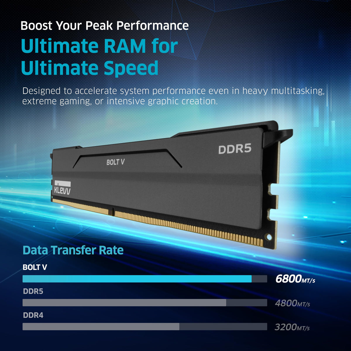 Q: How does the design of KLEVV Bolt V enhance its performance?A: The KLEVV Bolt V features a minimalist design with a powerful aluminum heatsink that not only looks sleek but also provides efficient heat dissipation. This design helps maintain optimal operating temperatures, contributing to the RAM's stability and performance during intense gaming or multitasking sessions.