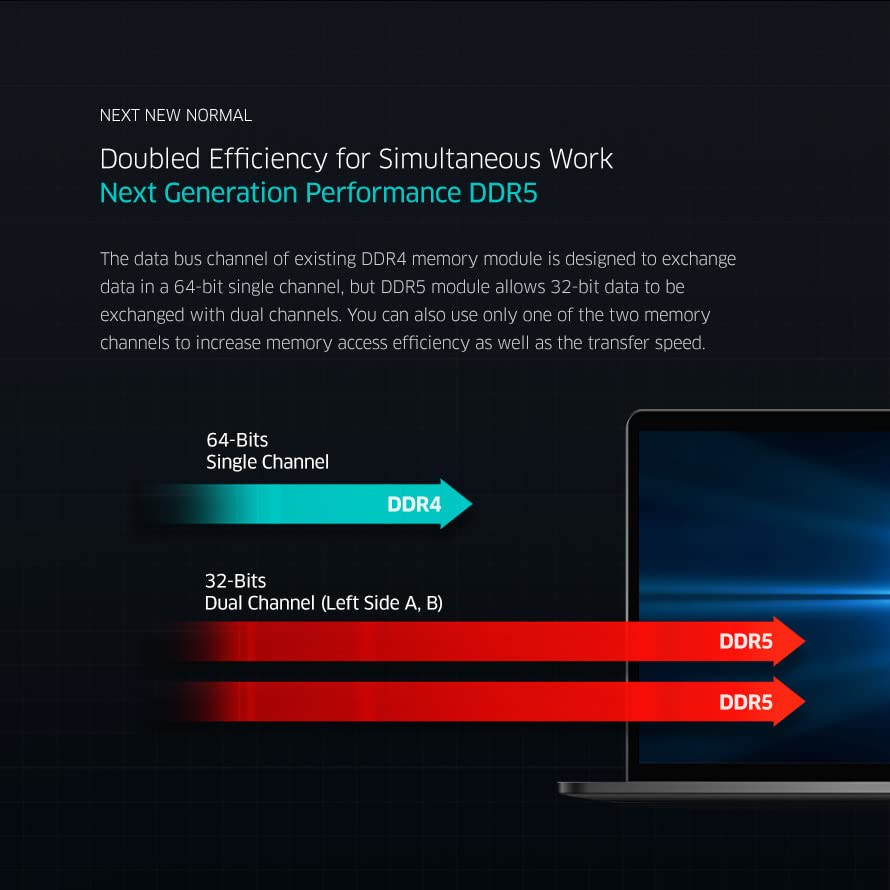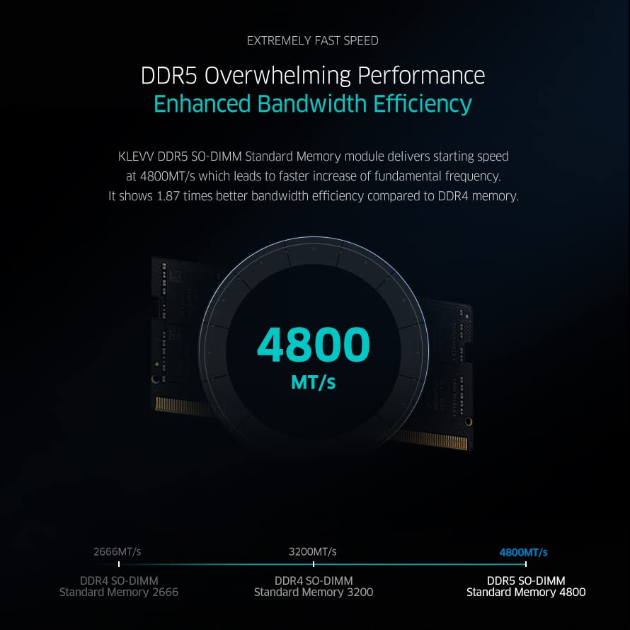 Ddr5 Overwhelming Performance Enhanced Bandwidth Efficiency: Klevv Ddr5 So-Dimm Memory Module Delivers Starting Speed At 4800Mt/S Which Leads To Faster Increase Of Fundamental Frequency. It Shows 1.87 Times Better Bandwidth Efficiency Compared To Ddr4 Memory. Lower Voltage, Highly Improved Performance Built-In Pmic: While Achieving 20% Lower Power Consumption Compared To Ddr4 Memory, Ddr5 Memory Can Reduce Dynamic Voltage And Increase Power Efficiency, Enabling For Better Power Distribution. Improved Work Efficiency Fast Data Transfer: With Higher Memory Bandwidth And Even Faster Speed, Ddr5 Memory Can Shorten The Response Time Of Multi Core Processor And Optimize The System Performance As A Whole. Through This, More Efficient Multitasking Can Be Delivered. Innovative Power Management Technology Built-In Pmic: The Ddr5 Has Power Management Transferred From The Motherboard To The Memory And Effective System Power Loads Are Managed Through Pmic Technology. Decreased Operating Voltage: The Ddr5 Can Exhibit High Performance Even With A Lower Operating Voltage Of 1.1V. Next Generation Performance Ddr5: The Data Bus Channel Of Existing Ddr4 Memory Module Is Designed To Exchange Data In A 64-Bit Single Channel, But Ddr5 Module Allows 32-Bit Data To Be Exchanged With Dual Channels. You Can Also Use Only One Of The Two Memory Channels To Increase Memory Access Efficiency As Well As The Transfer Speed. Fixing Issue From The Chip Itself Improving Stability Through On-Die Ecc: On-Die Ecc (On-Die Error Correction Code) Inside The Chip Allows Single-Bit Correction. It Improves Application Security By Enhancing Overall Data Reliability. Reliable Performance With The Latest Intel And Amd Platforms: Ensure Compatibility And Best Performance On The Latest Platforms From Intel And Amd. Klevv Ddr5 So-Dimm Memory Is Compatible With Up To Date Hardware Platforms, Including Intel 12Th-Gen Alder Lake And Amd Ryzen 6000 Series. Qvl Approved Wide And Reliable Compatibility: Klevv Ddr5 So-Dimm Standard Memory Has Been Tested For Complete Compatibility With All Major Motherboards In The Market. Qvl Approved And Compatible With Mainstream Motherboards/Platforms. Complied With Various International Standards More Reliable User Experience: Klevv Ddr5 So-Dimm Standard Memory Is Produced In Compliance With Strict Safety Regulations. Klevv Followed Various International Safety Standards Considering The Environment, Health, And Safety Of Users.