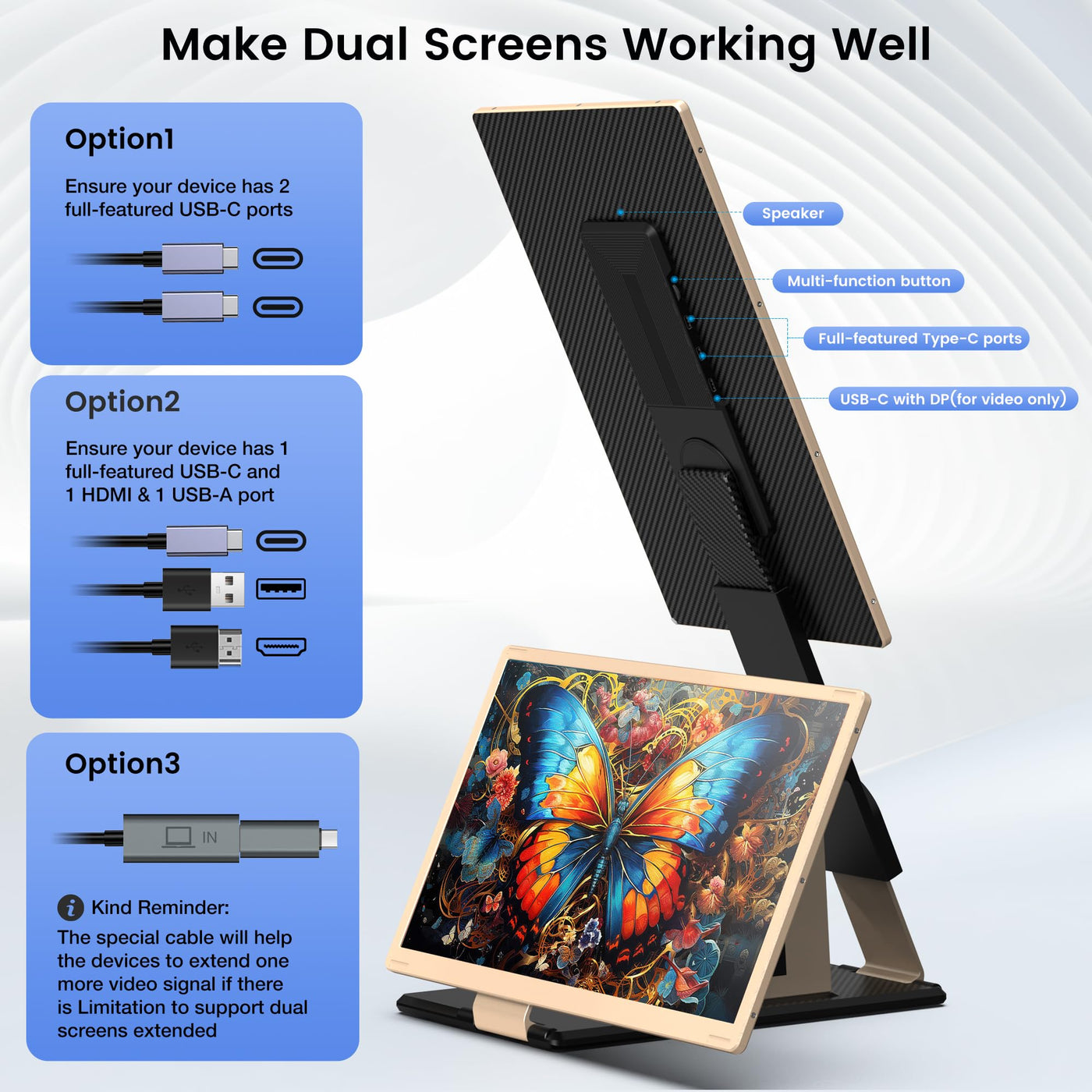 Q: How does the detachable design of the monitor extender enhance usability?A: The detachable design allows for customizable setups, enabling users to create their ideal workstation configurations. It can be used as a standalone portable monitor, a folding stand, or a single screen stand, providing flexibility for various work scenarios.