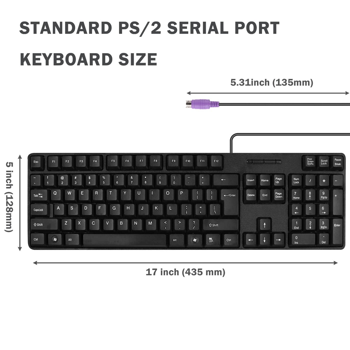 Product Specifications: Item Model Number:Ps2 689 Size:5 Inch H X 17 Inch L X 0.98 Inch W / 128 Mm H X 435 Mm L X 25 Mm W Color:Black. Weight:375G Key Number:104 Cable Length:1.3M The Key Material:Pvc Key Cap Material:Abs Interface:Ps/2 Key Life:More Than 15 Million Times