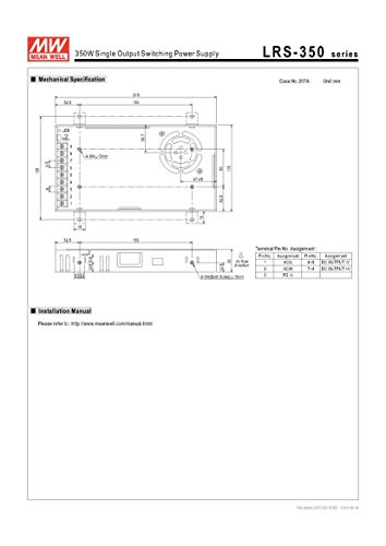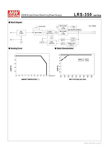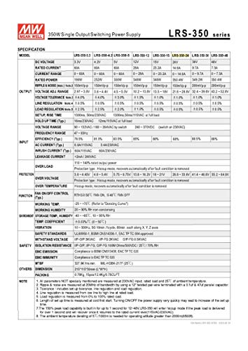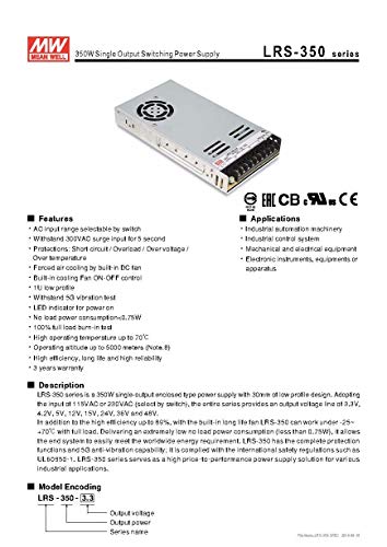 350.4W 24V 14.6A Single Output Switchable Power Supply 24 Volts 14.6 Amps Features � Ac Input Range Selectable By A Switch � Withstand 300 Vac Surge Input For 5 Seconds � No Load Power Consumption � 1U Low Profile � High Operating Temperature, Up To 70�C � Protections: Short Circuit / Overload / Over Voltage / Over Temperature � Built-In Cooling Fan, On-Off Control � Compliance To Ul 60950-1 � Withstand 5G Vibration Test � High Efficiency, Long Life And High Reliability � Led Indicator For Power On � 100% Full Load Burn-In Test � 3 Year Warranty Applications � Industrial Automation Machinery � Industrial Control System � Mechanical And Electrical Equipment � Electronic Instruments, Equipment Or Apparatus Related Products � Lrs-350-3.3 (3.3V 60A, 198W) Jameco P/N: 2219778 � Lrs-350-4.2 (4.2V 60A, 252W) Jameco P/N: 2219786 � Lrs-350-5 (5V 60A, 300W) Jameco P/N: 2219794 � Lrs-350-12 (12V 29A, 348W) Jameco P/N: 2219807 � Lrs-350-15 (15V 23.2A, 348W) Jameco P/N: 2219815 � Lrs-350-36 (36V 9.7A, 349.2W) Jameco P/N: 2219831 � Lrs-350-48 (48V 7.3A, 350.4W) Jameco P/N: 2219840 � Lrs-150 Series (150 Watt, Enclosed Switchable Single Output Power Supply) � Lrs-150F Series (150 Watt, Full Range Input Enclosed Switching Power Supply) � Lrs-200 Series (200 Watt, Enclosed Switchable Single Output Power Supply) Detailed Specifications: � Primary Output Voltage (Vdc): 24 � Output Current (A): 14.6 � Maximum Output Power (W): 350 � Family: Lrs-350 � Input Voltage (Vac): 90 To 132, 180 To 264 � Input Frequency: 47 To 63 � Maximum Input Current (A): 6.8 � Output Connector Type: Screw Terminal Block � Number Of Outputs: 1 � Product Type: Ac To Dc Power Supply (More.).