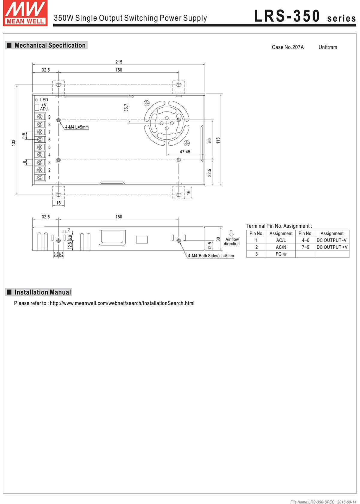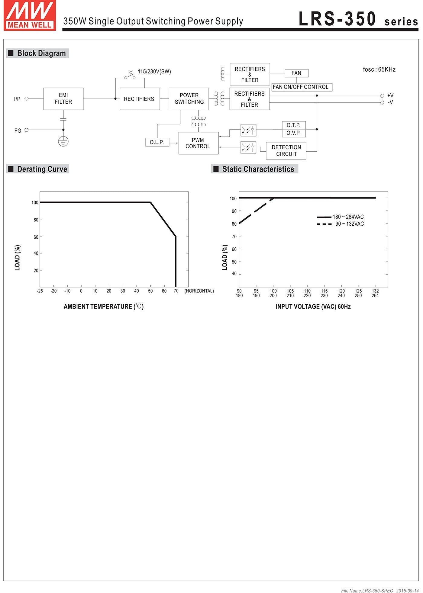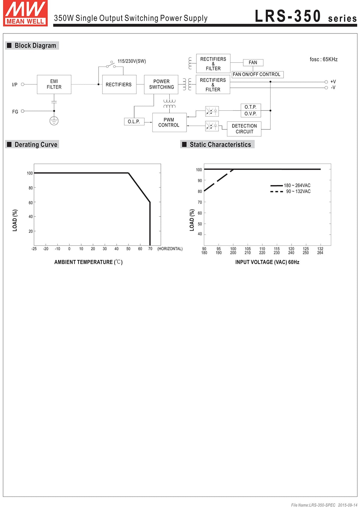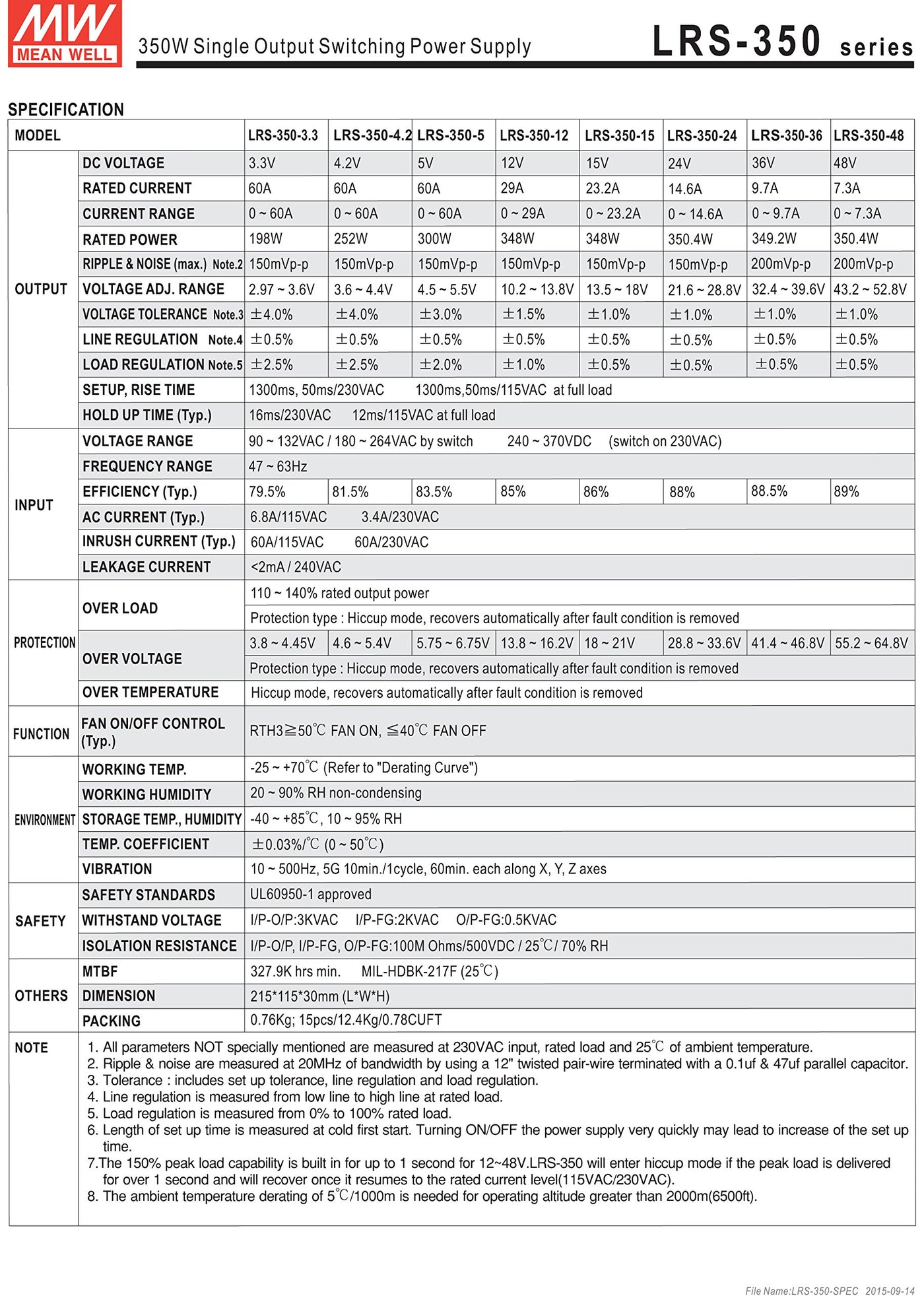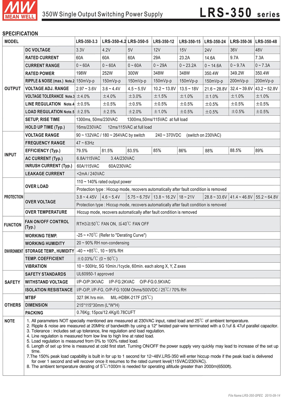 350.4W 48V 7.3A Single Output Switchable Power Supply 48 Volts 7.3 Amps Features � Ac Input Range Selectable By A Switch � Withstand 300 Vac Surge Input For 5 Seconds � No Load Power Consumption � 1U Low Profile � High Operating Temperature, Up To 70�C � Protections: Short Circuit / Overload / Over Voltage / Over Temperature � Built-In Cooling Fan, On-Off Control � Compliance To Ul 60950-1 � Withstand 5G Vibration Test � High Efficiency, Long Life And High Reliability � Led Indicator For Power On � 100% Full Load Burn-In Test � 3 Year Warranty Applications � Industrial Automation Machinery � Industrial Control System � Mechanical And Electrical Equipment � Electronic Instruments, Equipment Or Apparatus Related Products � Lrs-350-3.3 (3.3V 60A, 198W) Jameco P/N: 2219778 � Lrs-350-4.2 (4.2V 60A, 252W) Jameco P/N: 2219786 � Lrs-350-5 (5V 60A, 300W) Jameco P/N: 2219794 � Lrs-350-12 (12V 29A, 348W) Jameco P/N: 2219807 � Lrs-350-15 (15V 23.2A, 348W) Jameco P/N: 2219815 � Lrs-350-24 (24V 14.6A, 350.4W) Jameco P/N: 2219823 � Lrs-350-36 (36V 9.7A, 349.2W) Jameco P/N: 2219831 � Lrs-150 Series (150 Watt, Enclosed Switchable Single Output Power Supply) � Lrs-150F Series (150 Watt, Full Range Input Enclosed Switching Power Supply) � Lrs-200 Series (200 Watt, Enclosed Switchable Single Output Power Supply) Detailed Specifications: � Primary Output Voltage (Vdc): 48 � Output Current (A): 7.3 � Maximum Output Power (W): 350 � Family: Lrs-350 � Input Voltage (Vac): 90 To 132, 180 To 264 � Input Frequency: 47 To 63 � Maximum Input Current (A): 6.8 � Output Connector Type: Screw Terminal Block � Number Of Outputs: 1 � Product Type: Ac To Dc Power Supply (More.).