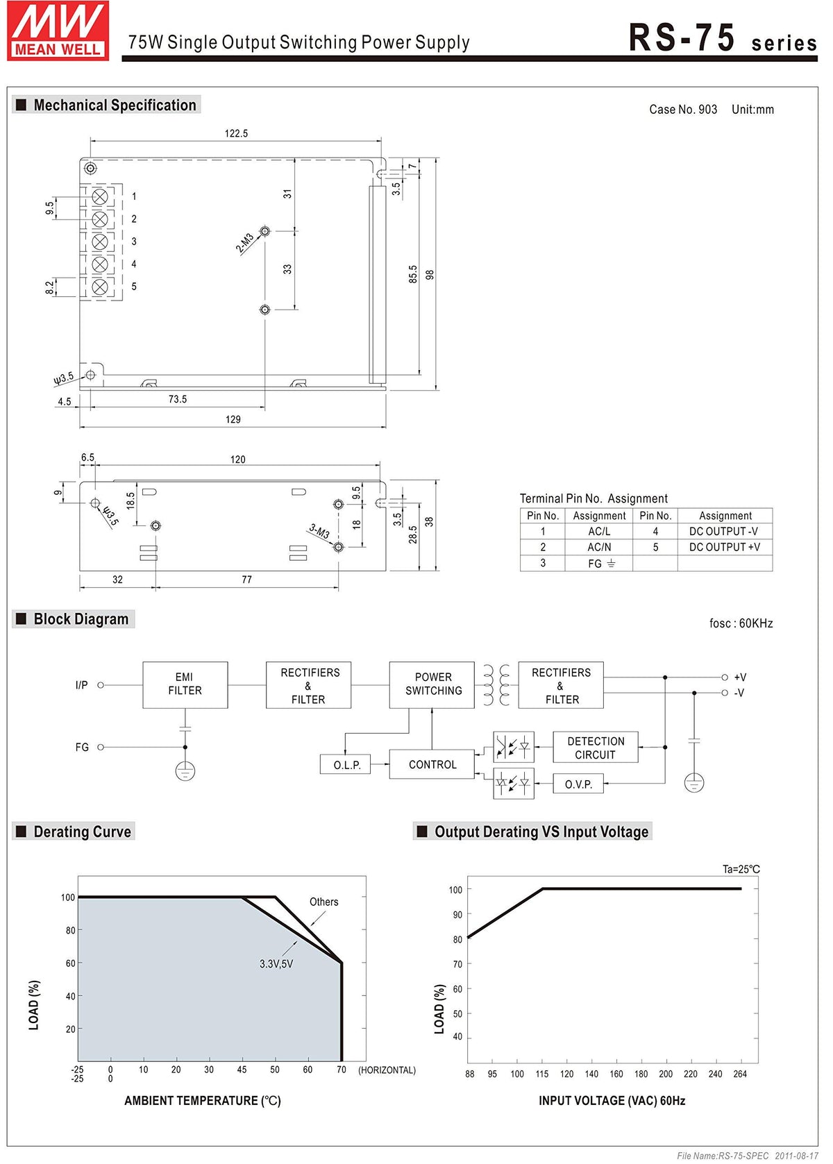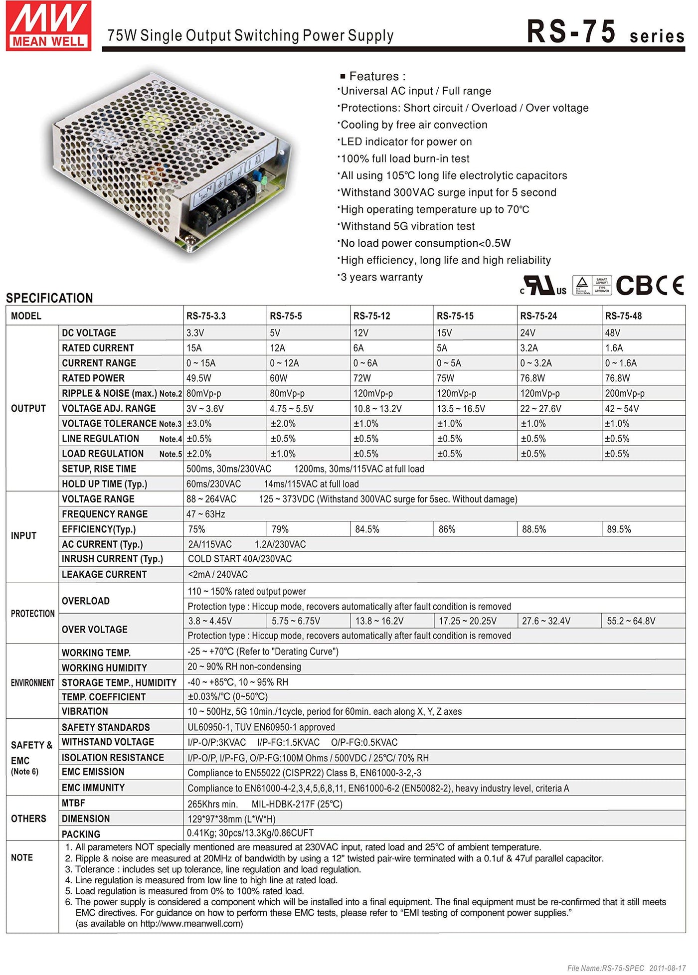 Mean Well Rs 75 12 Ac To Dc Power Supply, Single Output, 12V, 6 Amp, 72W, 1.5' 323599