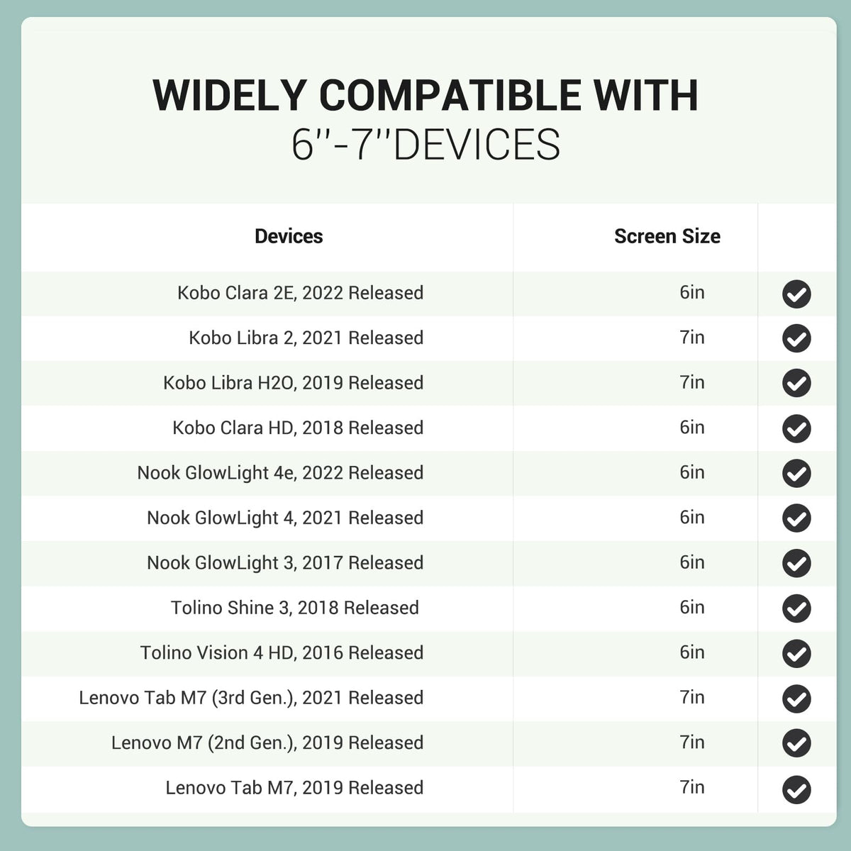 Compatibility: Universal tablet case for 6',6.8',7' E-reader Tablet. The inside elastic straps can fit different tablets like Fire Tablet/Kindle/Kobo Nia/Kobo Clara HD/Lenovo M7/Voyaga/Sony/Tolino 6',6.8',7' E-reader. (NOTE: Please measure your tablet's dimension before purchasing) | Lightweight and Protective: Made of premium PU leather exterior and microfiber interior, the case is soft to touch while it can protect your device well from scratches. Besides, the case will not weigh too much so that you can carry it easily. | Enjoyable and Portable: With the elastic hand strap for one-hand use, you can grip your tablet more firmly and conveniently in different situations, such as on the bus/subway or in the library/coffee shop, without the worries about accidental falling. | Thoughtful Features: With a well-made elastic strap to fix the front cover, the case will keep closed firmly when you need to use the hand strap or just need to close the case. | Built-in Kickstand: Three comfortable viewing angles available for reading, writing and notetaking, improving your user experience.