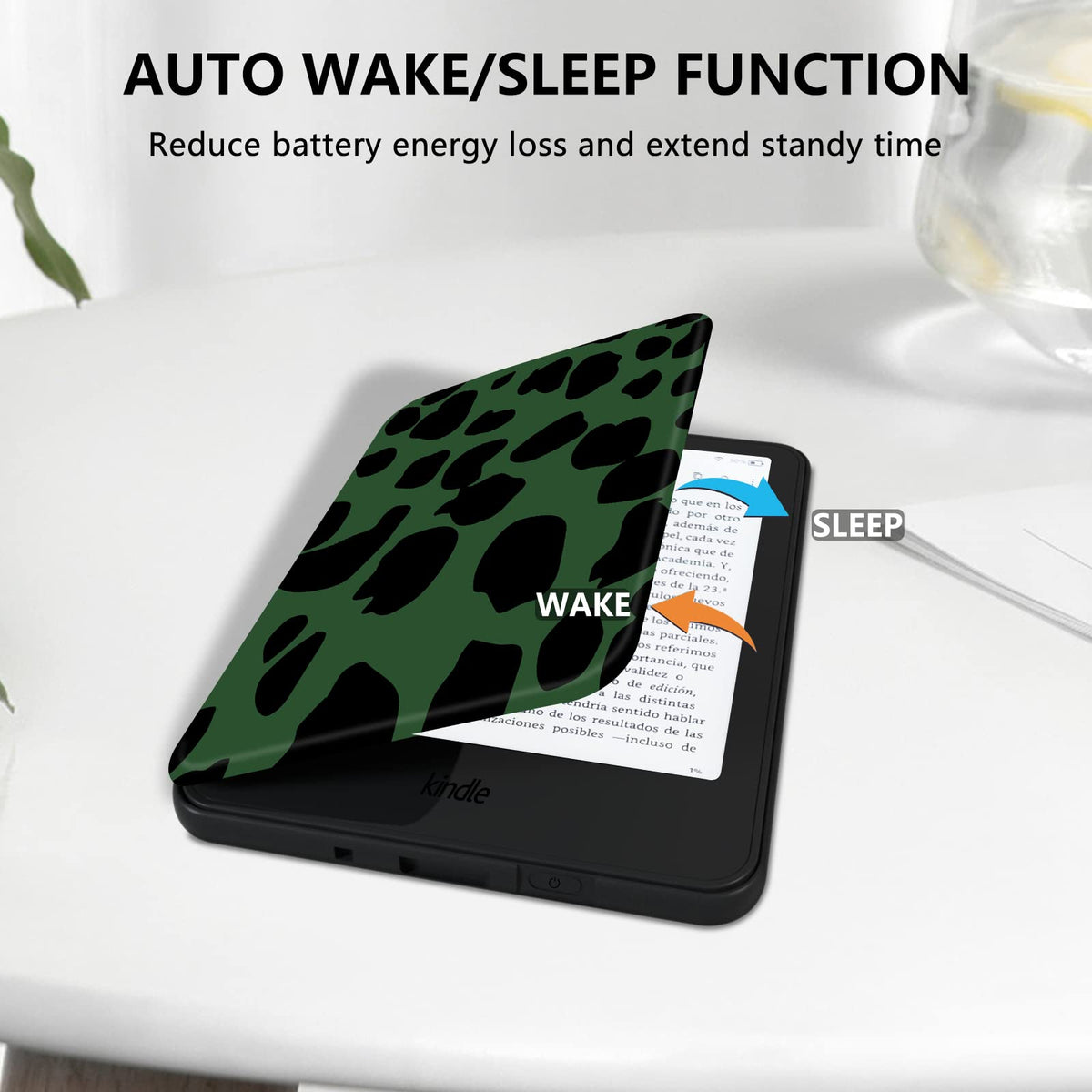 Q: How does the auto wake/sleep feature work?A: The auto wake/sleep feature allows your Kindle to automatically turn on when you open the case and enter sleep mode when you close it, helping to conserve battery life.