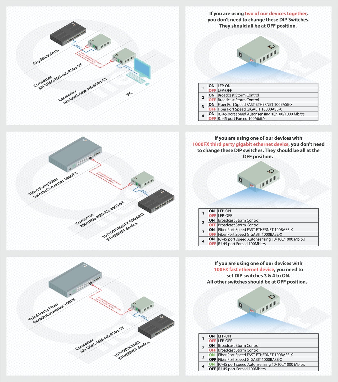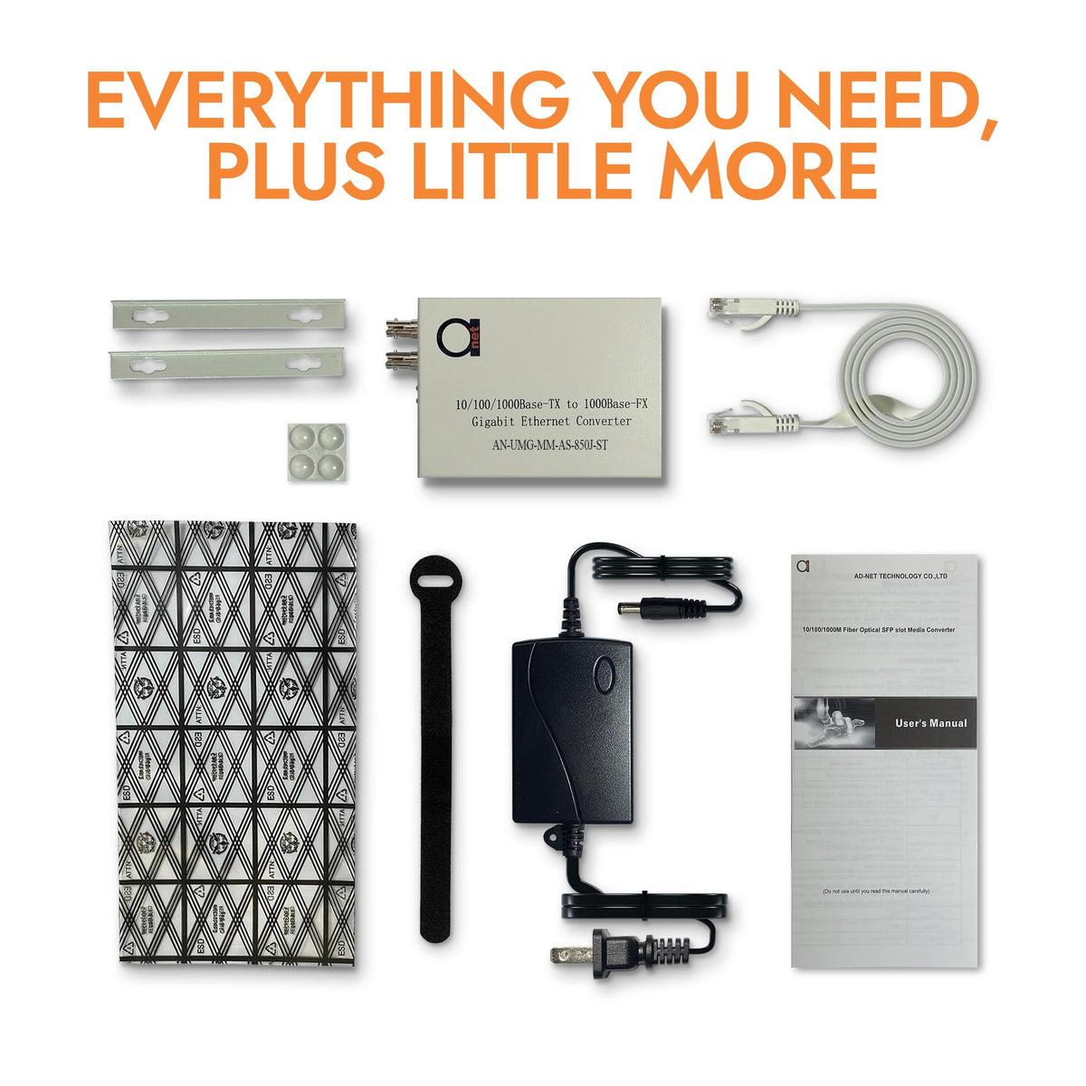 Extend Your Gigabit Or Fast Ethernet Network Over Multi Mode Fiber Up To 550 M - 0.34 Miles - (Using 850 Nm Wavelength St Connector Fiber Optical Module Is Already Pre-Built On Board) With Ease An-Umg-Mm-As-850J-St Will Automatically Detect 10 Mbit/S Or 100 Mbit/S Fast Ethernet Or 1000 Mbit/S Gigabit Port - You Just Need Plug In The Cables And It Will Work Right Away! Powering It Up? Easy, It Will Come With Ac Power Adapter In Set, Just Plug It! All These Important Features Are All Supported: Compliant With Ieee 1000Base-T And 1000Base-Sx One 10/100/1000Base-T Rj-45 Port Autosensing Featured One 1000Base-Sx Multi Mode Dual Fiber Type Port With St Connector - Up To 550 M (0.34 Miles) Distance Status Led Indicators For Power, Link/Activity, Full-Duplex, And Speed Standards: Ieee802.3Z/Ab 100/1000/1000Base-T 1000Base-Sx Power Supply: 100 To 240Vac 50 To 60Hz Dimensions: 70.5Mm - 2.77In - (L) X 94Mm - 3.7In (W) X 26.5Mm - 1.04In (H) Environment: Relative Humidity; 5% To 90% Operating Temperature: 0 To 70 Degree Celsius Ce, Fcc, Rohs, Lvd Certified Supports Jumbo Ethernet Frames Up To 9000 Bytes (If Needed, Configurable By Dip Switches) Supports Llf Feature - Link Loss Feature - (If Needed, Configurable By Dip Switches) Media Converter Will Extend Your Lan Network With Any Standard Ethernet Interface To Distances With 550 Nm (0.34 Miles) Or Less - You No Need To Use Attenuator Also For Significantly Less Distances Than 550 Nm (0.34 Miles) As Well. Setup Of These Units Are Really Easy As The 3 Steps Shown In Picture Gallery, And All Default Settings Will Work For All Of Your Cases, But For Sophisticated Users We Had Created Some More Customized Settings Available Via Dip Switches On Unit'S Back Panel. It'S Always Good To Have Versatile And Adaptive Unit To All Your Cases!