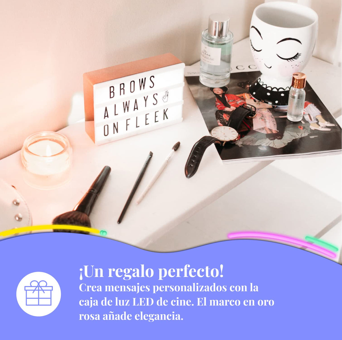 Q: What materials are used in the construction of this light box?A: The light box is made from high-quality acrylic, featuring a stylish rose gold plated frame that adds an elegant touch to any decor.
