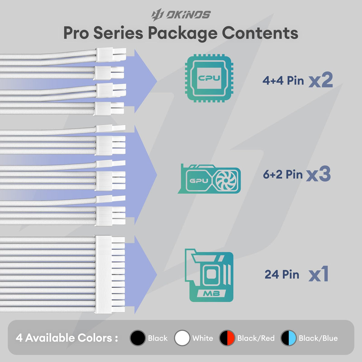 Q: What is the length of the cables in the Okinos PSU Extension Cable Kit?A: The Okinos PSU Extension Cable Kit includes cables that are 300mm (30cm) in length. This length is ideal for most PC cases, allowing for flexible routing and neat cable management.