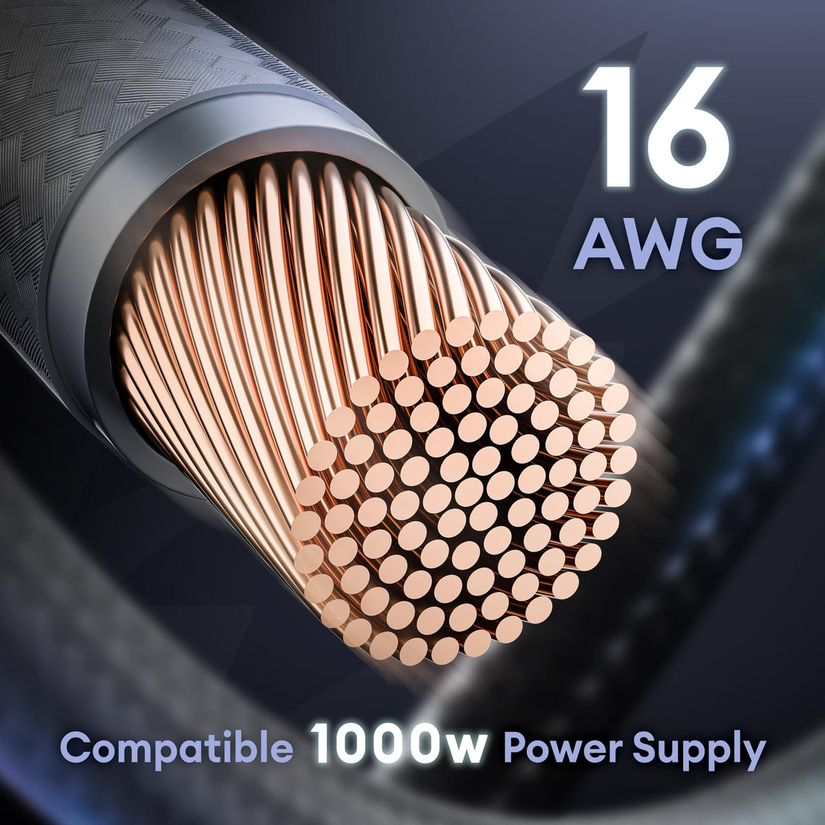 High Compatibility: Designed For Motherboards With 13Th Gen Intel Cpus, Featuring 2*(4+4)Pin Cables For Professional Overclocking Users To Experience Ultimate Performance. | Golden Plating On 6+2 Pins: The (6+2)Pin Pci-E Cables Feature 1Um Golden Plating, Enhancing The Cable'S Ability To Withstand Current And Ensuring Stable Power Supply. | Easier Installation: Utilizes U-Terminal Plugs With A Larger Contact Surface (10% Improvement Compared To Square-Terminal), Facilitating Easier Connections Between Ports And Pins. | Thick Cable With Warm Sheen: Boasts A Woven Appearance With A Triple Layer Weaving Design Featuring 16Awg, 300Mm Cables That Are 100% No Heatshrink. | Premium Nylon Sleeve Cables: Includes (1) 24-Pin Atx, (2) 4+4-Pin Eps, And (3) 6+2-Pin Pci-E Cables, Compatible With All Power Supplies.