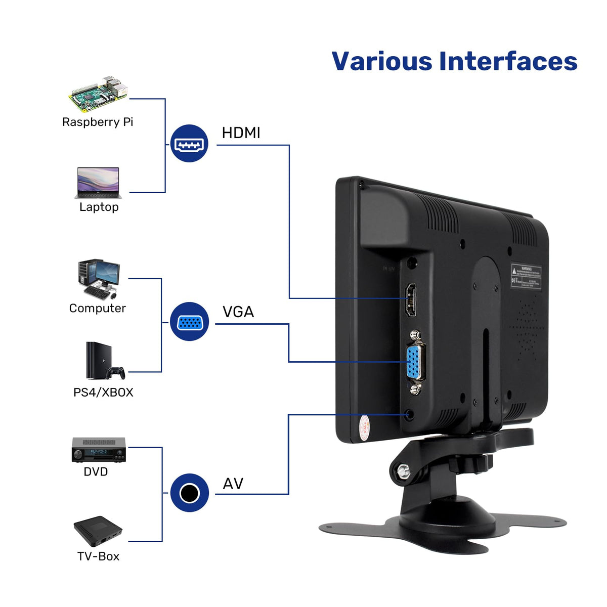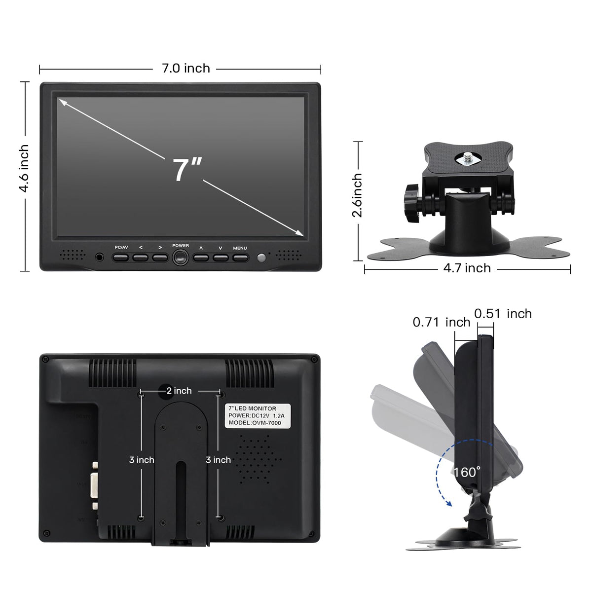 7 Inch Ultrathin Color Security Cctv Monitor This 7 Inch Led Display Screen Has Sleek, Slim Design With An Elegant Stand Seamlessly Blends Into Any Tight Space, And Takes Up Less Desktop Space For A Cleaner-Looking Office.It'S A Professional Monitor With Hd 1024X600 Resolution Offers Clear Color Image. Support Two Way Installation, It Can Be Easily Mounted On The Wall With The Industry Standard Vesa 75 Mount ( Not Include ), Or Mounted On Desktop By Provided Adjustable Mount Stand. High Sensitivity And Strong Anti-Jamming, Perfect For Security & Home Use. Specifications: Screen Size: 7 Inch Screen Resolution: 1024*600 Screen Brightness: 400Nits Video Input: Vga, Hdmi, Av Storage Temperature: -10 Degree To 60 Degree Menu Language:English,French,German,Chinese,Italian,Spanish Etc. Support For Vga Input, Can Be Used For Computer Liquid Crystal Display Warm Tips : There No Touch Function With Screen, Only Touch Button . There No Built-In Battery, It Should Be Used With Dc Power Plug In For Power Supply. Package Includes: 1 X Monitor 1 X Bracket 1 X Vga Cable 1 X Hdmi Cable 1 X Av Cable 1 X Remote Control 1 X User Manual