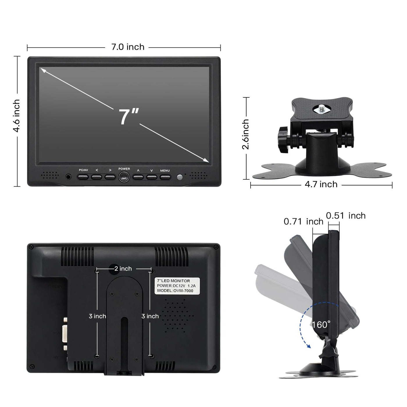 Q: What are the main features of the OSCY 7 Inch Small Monitor?A: The OSCY 7 Inch Small Monitor features a 1024x600 HD resolution, a 7-inch IPS LCD screen, multiple input options including HDMI, VGA, and AV ports, and a lightweight design weighing only 0.68 lbs. It also includes a built-in speaker, remote control for easy operation, and supports two-way installation options.