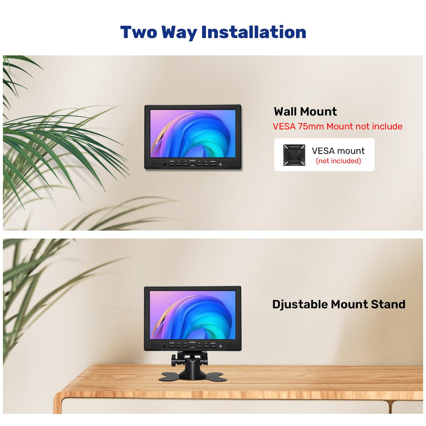 Q: Is the monitor portable and easy to set up?A: Absolutely! The monitor's compact size (7x4.6 inches) and lightweight design make it highly portable. It can be easily set up on a desktop using the adjustable stand or mounted on a wall with a VESA 75mm mount (not included).