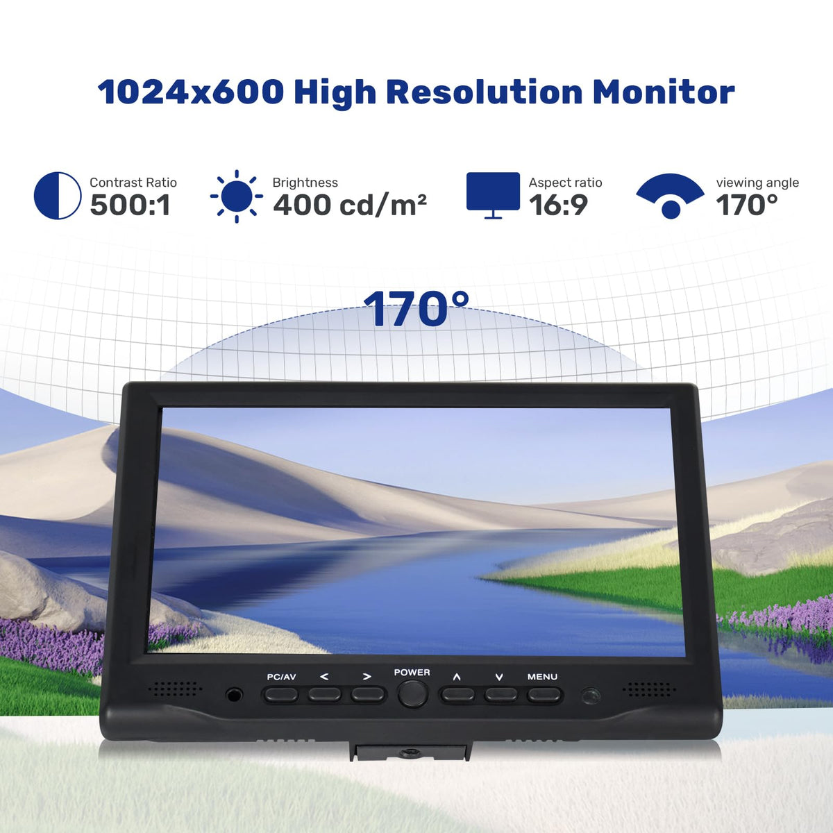 Q: What should I know about the monitor's display quality?A: The monitor offers a high resolution of 1024x600, 800:1 contrast ratio, and 400 cd/m² brightness. This ensures vivid, bright, and saturated images, providing a clear and colorful visual experience even on its small screen.