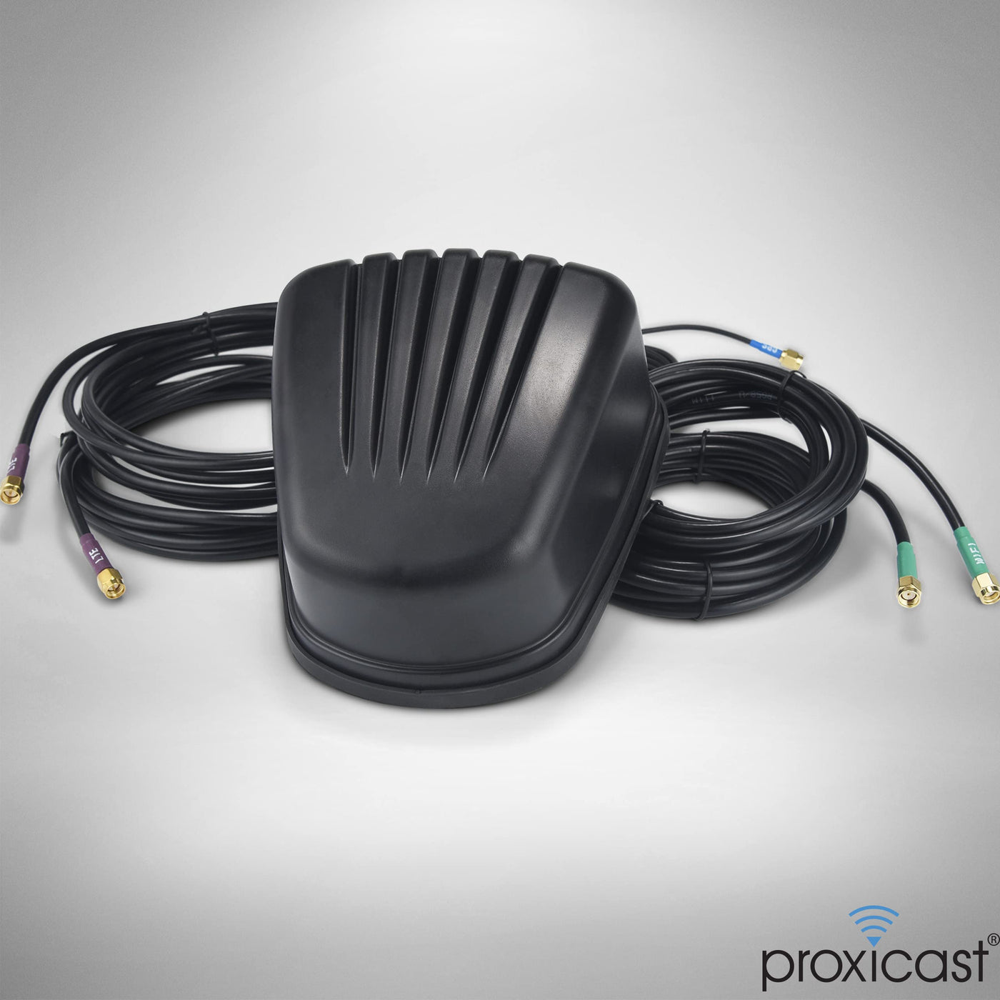 Q: What types of devices is the Proxicast 5-in-1 antenna compatible with?A: The Proxicast 5-in-1 antenna is compatible with various multi-radio routers and modems from brands such as Cradlepoint, Digi, Peplink, Sierra Wireless, Cisco, and CalAmp, making it suitable for a wide range of vehicular applications.