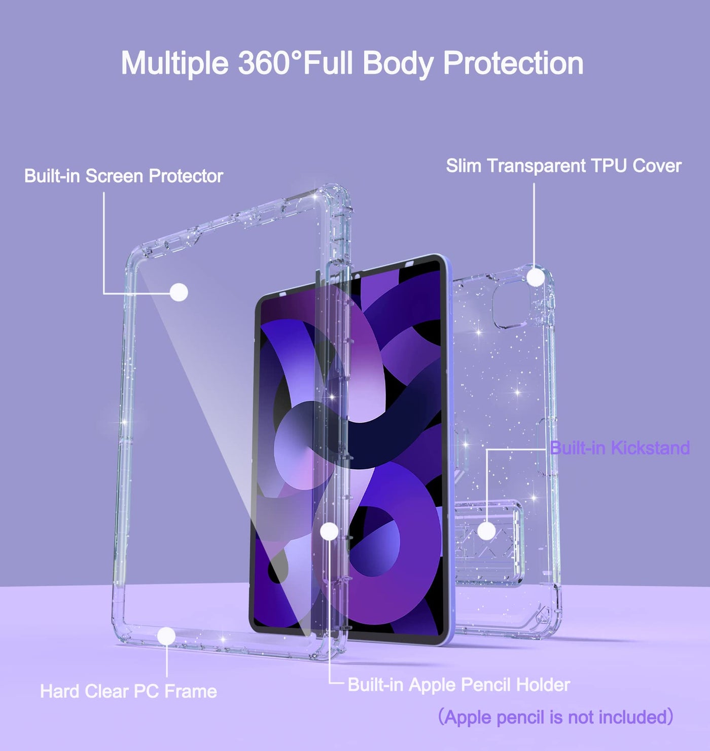 Q: How does the built-in screen protector work with the iPad Air case?A: The Rantice iPad Air case includes a built-in crystal-clear screen protector that provides full coverage, protecting your screen from scratches and drops while maintaining touch sensitivity. It is easy to install and does not create bubbles.