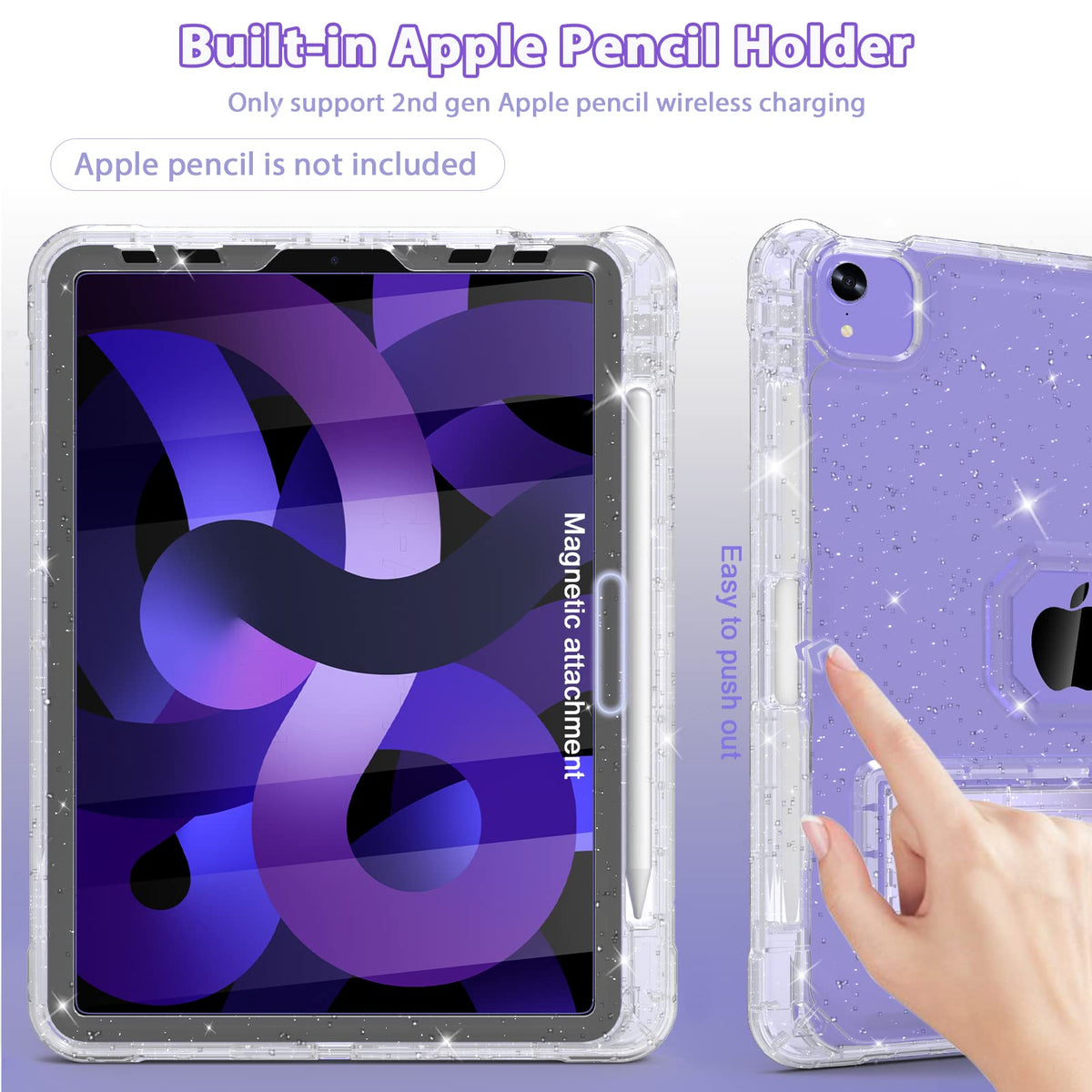 Q: Can I use my Apple Pencil with this iPad Air case?A: Yes, the Rantice iPad Air case features a dedicated holder that supports the 2nd Generation Apple Pencil's magnetic attachment and wireless charging. However, the Apple Pencil is not included with the case.