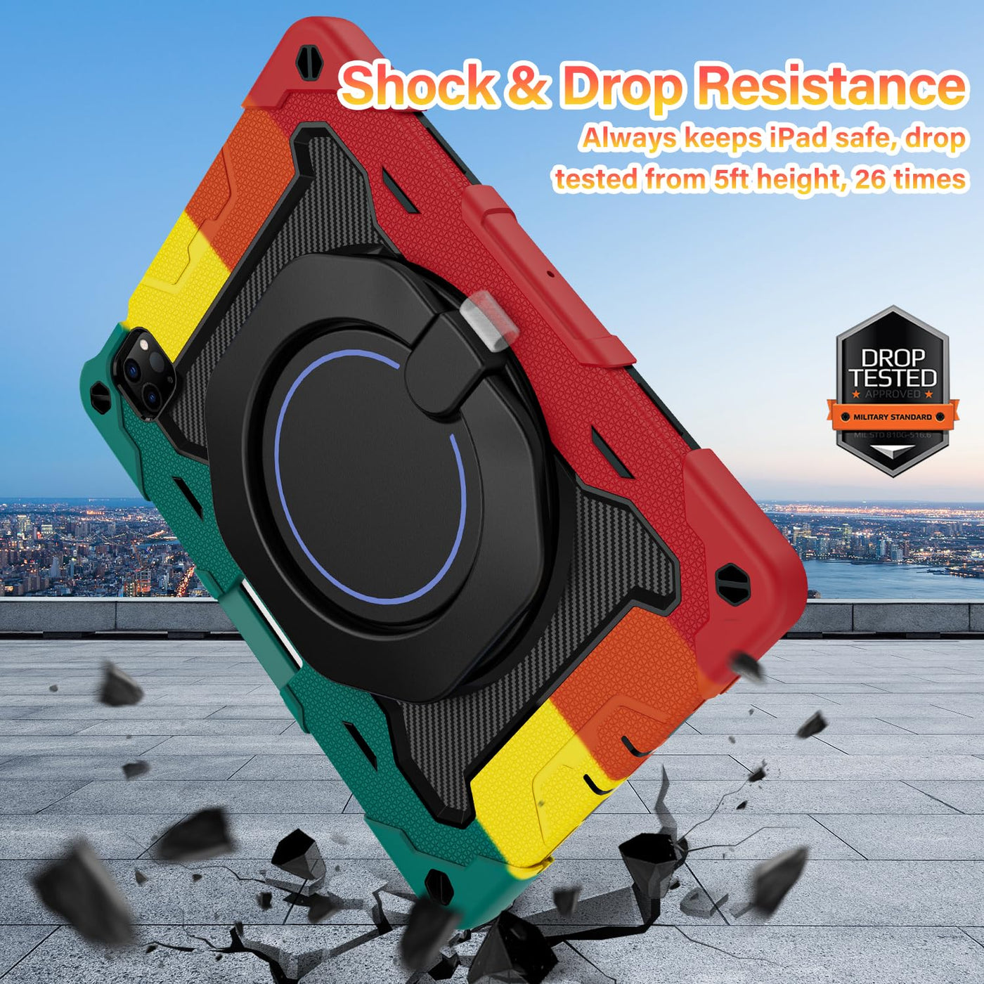 Q: What type of protection does this case offer for my iPad?A: This case provides advanced drop protection with a shock-absorbing silicone shell designed to exceed Military Grade Drop Test Standards. It features a built-in HD screen protector and a unique 3-layer construction for maximum impact resistance.