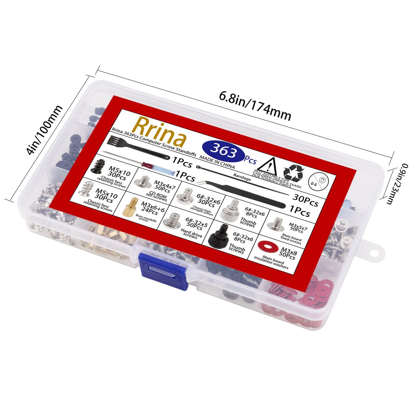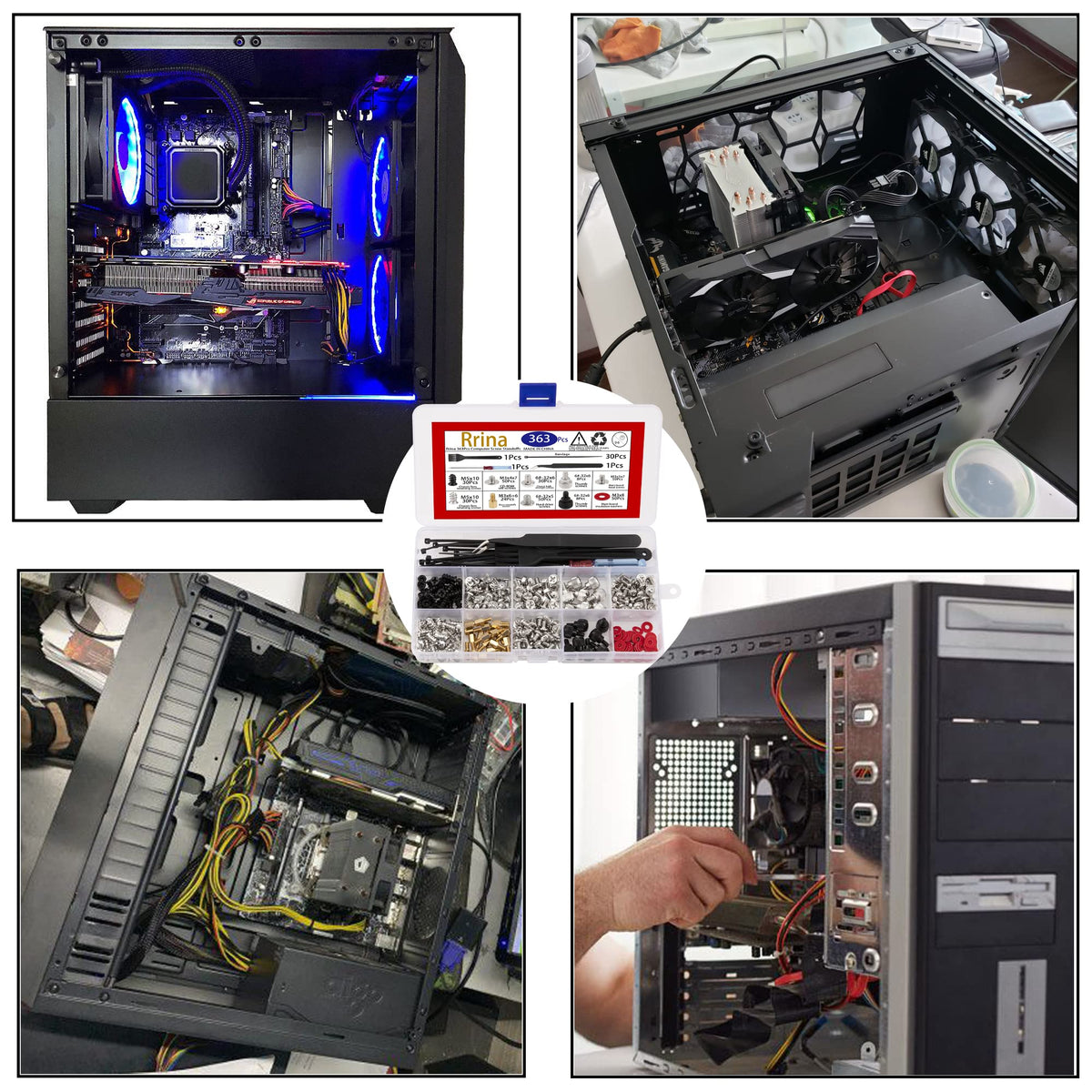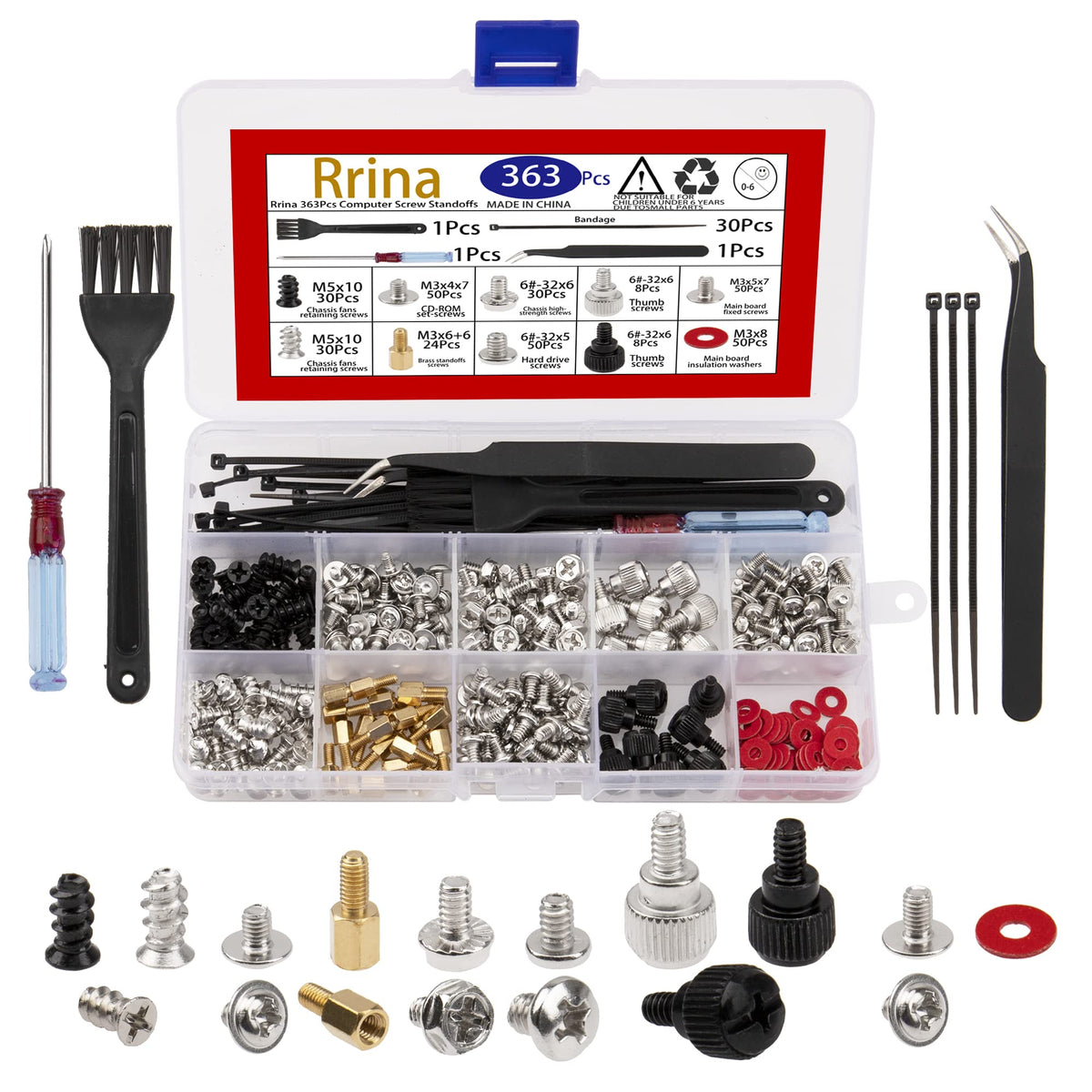 Material: Brand New High Quality Computer Screws, High Hardness, Not Easy To Rust, Anti-Moisture, Anti-Oxiclation, Corrosion Resistant. Suitable For: 2.5'' Ssd, Computer Case, Power Supply, Motherboard, Hard Drives, Fan And Floppy/Cd-Rom/Dvd-Rom Drives Fixed Installation. Plastic Heat Seal Packaging: Practical And Convenient Of Packing Box. All Of Screws Packed In A Durable And Sturdy Box, This Box Can Be Use For A Storage Box. Durable Divided Storage Case: All Screws Are Packed In The Box With Size Label And Divider, Easy To Store And Won'T Mix Up. What You Will Get: Chassis Fan Retaining Screw(Black M5 X 10)----------------30Pcs Chassis Fans Retaining Screw (Nickel Plated M5 X 10)-----30Pcs Cd-Rom Set Screws (M3 X 4 X 7)----------------------------50Pcs Main Board Brass Standoffs Screws (M3 X 6 + 6)----------24Pcs Chassis High-Strength Screws 6#-32*6--------------------30Pcs Flat Head Hard Drive Screws 6#-32*6 ---------------------50Pcs Chassis Hand Twist Screws (Silver 6#-32*6)----------------8Pcs Chassis Hand Twist Screw (Black 6#-32*6)-----------------8Pcs Main Board Fixed Screws M3 X 5 X 7-----------------------50Pcs Main Board Insulation Washers M3 X 8------------------50Pcs Bandage----------------------------------------------------30Pcs Bolt Driver--------------------------------------------------1Pcs Brush-------------------------------------------------------1Pcs Clip----------------------------------------------------------1Pcs Note: Due To The Difference Between Different Monitors, The Picture May Not Reflect The Actual Color Of The Item. Warm Tips: Products Contain Small Parts, Please Do Not Let Children Play, To Prevent Inadvertent Swallowed. Customers Service: We Will Support Lifetime Garrantee And 100% Money Back For Your Pr