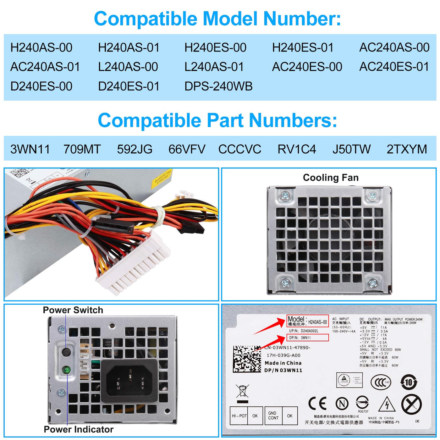 ?Compatible Model?The Power Supply Only Works For Dell Optiplex 390 790 960 990 3010 7010 9010 Desktop Pc (Dell Sff System). Ac Input: 100-240V/4A (50-60Hz), Dc Output: Maximum Output Power: 240W | ?Note?Power Supply Does Not Work For Dell Mt Mini Tower, Dt Desktop System, Usff Ultra Small Form Factor Systems. | ?Compatible Part Number?3Wn11 709Mt 592Jg 66Vfv Cccvc Rv1C4 J50Tw 2Txym | ?Compatible Model Number?H240As-00, Ac240As-00, L240As-00, Ac240Es-00, H240As-00, H240Es-00, D240Es-00, Dps-240Wb | ?Quality Service?If The Product Has Any Quality Problems Within One Month, You Can Contact Us Quickly By Email And We Will Provide You With A Free Return Service.