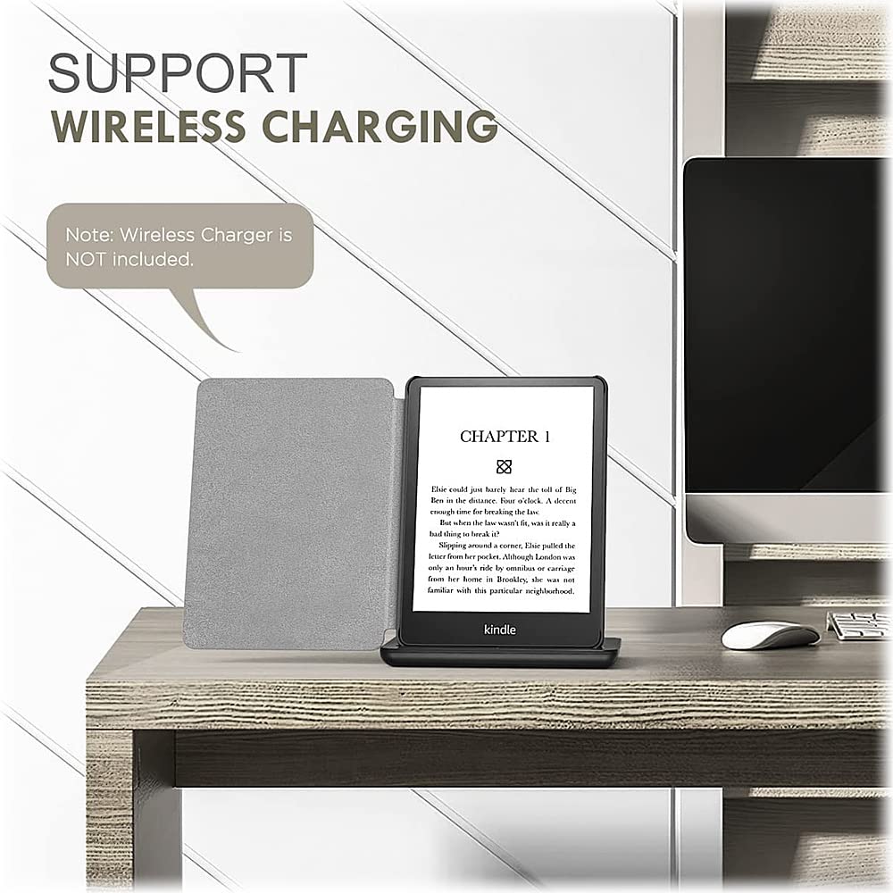 Q: What materials are used in the construction of this Kindle case?A: The case is made from vegan leather and TPU materials, which provide durability, reduce stretching and yellowing over time, and maintain a lightweight profile.
