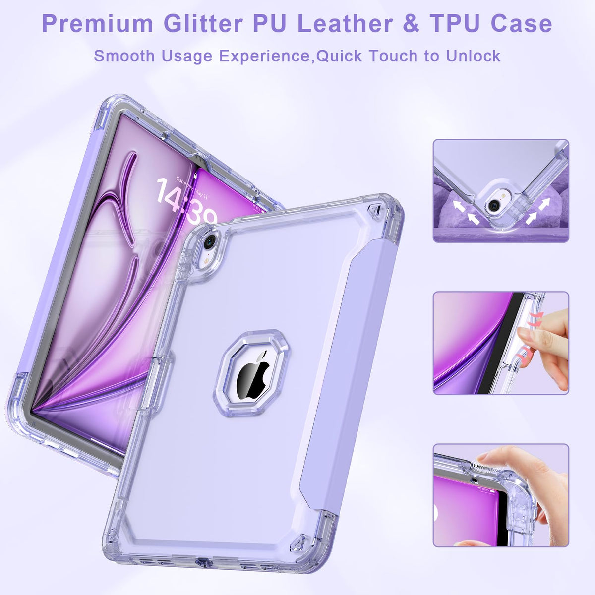Q: What materials are used in this iPad case?A: This iPad case features a combination of soft TPU for the back and a glittering leather exterior. The materials are designed to provide lightweight protection while being easy to clean and resistant to dust.