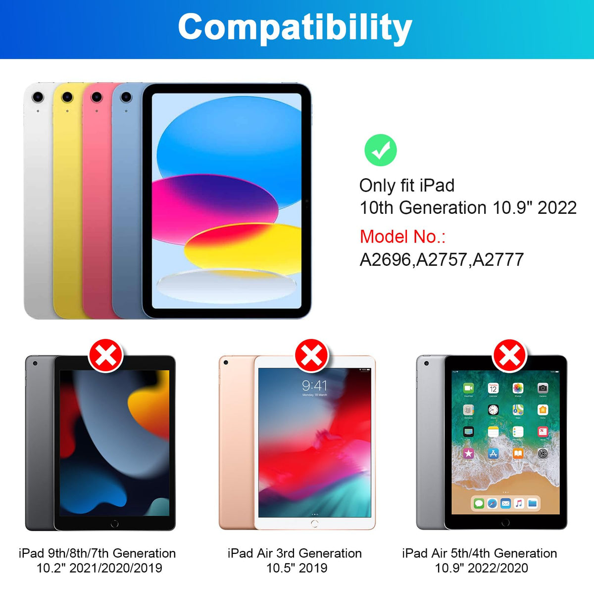 Q: Is the SOPPY Keyboard Case compatible with other iPad models?A: The SOPPY Keyboard Case is specifically designed for the iPad 10th Generation 10.9 inch model (A2696/A2757/A2777). It is not compatible with other iPad models, so please check the model number on the back of your iPad before purchasing.