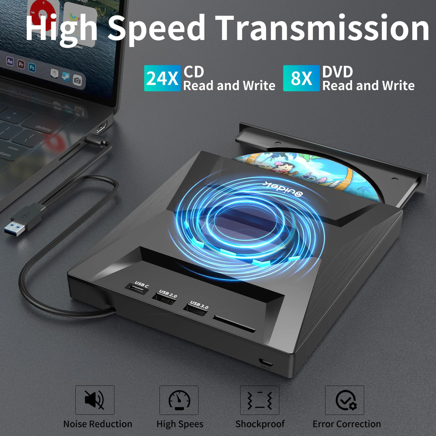 Q: What additional features does the SUIDEK External CD DVD Drive offer?A: In addition to reading and writing CDs and DVDs, this drive also functions as a USB hub with multiple ports, including USB 2.0, USB 3.0, and Type C, along with an SD card slot for easy data transfer.