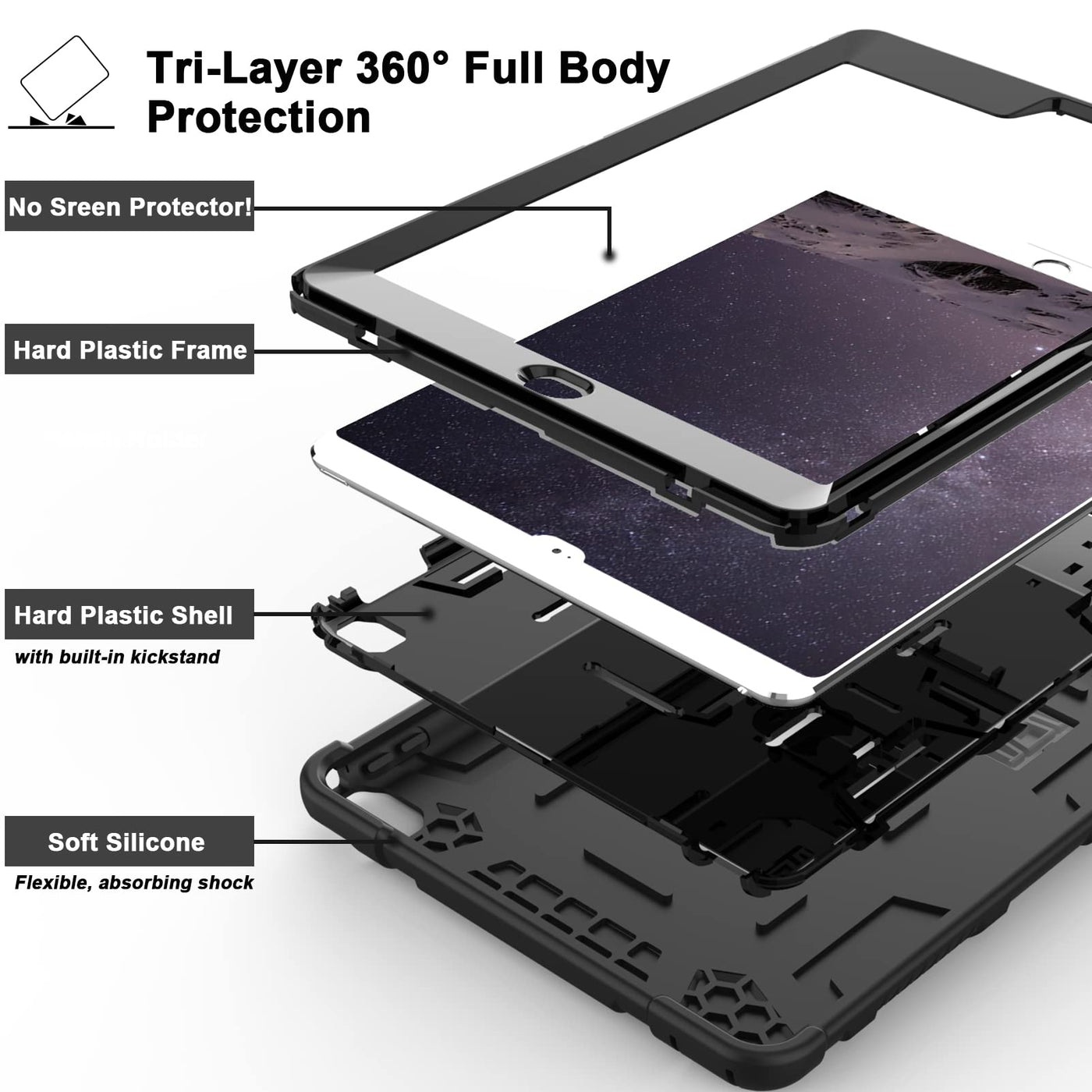 3 In 1 Shockproof Kickstand Protective Case Cover: Compatible Ipad Models: Ipad Air 2 ( Model : A1566, A1567) &Nbsp; Advanced 3 Layer Protection Top Pc Frame---Anti-Scratch; Inner Pc Bumper Lining----Protect From Heavy Dust; Soft And Durable Silicone Outer Shell---Effectively Release Shock. &Nbsp; Hands-Free Kickstand Feature Different Viewing Positions (Portrait View &Amp; Landscape View) To Adjust For Comfortable Movie-Watching And Typing Positions. You Can Easily Watch Movies, Videos Or Make Video Calls With Other People In A Landscape Mode. &Nbsp; Raised Lip For Screen And Camera Protection Raised Lip For Lens Will Protect Your Camera, The Silicone Front Shell Makes Your Ipad Mini More Protection. So You Don'T Worry About Scratching Your Tablet When You Lay It Down. &Nbsp; Accurate Cut-Outs Easy Access To All Buttons, Ports, Camera, Sensors, Speakers, Headphone Jack And Controls Without Removing The Phone Case. &Nbsp; What'S In The Package --1X Case Cover For Ipad Air 2Nd&Nbsp;Case. Please Note: Case Only, Screen Protector And Other Accessories Are Not Included.