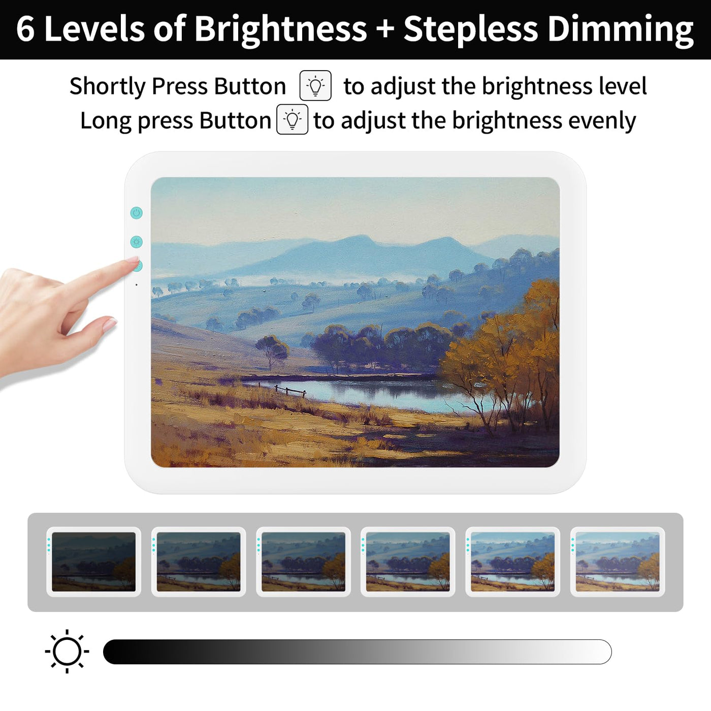 Q: How do I adjust the brightness on the TOHETO Light Pad?A: The TOHETO Light Pad includes 6 levels of stepless adjustable brightness. You can easily change the brightness by long-pressing the physical button to achieve a smooth transition or by shortly pressing to select from the 6 specific brightness levels.