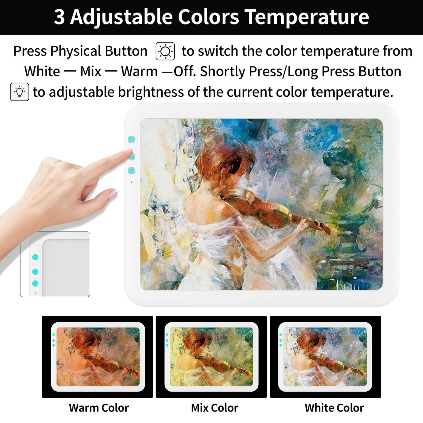 Q: Is the TOHETO Light Pad suitable for use in different lighting conditions?A: Yes, the TOHETO Light Pad offers 3 color temperature modes—cold white, regular white, and warm color—allowing you to choose the best lighting for your environment and protect your eyesight during extended use.