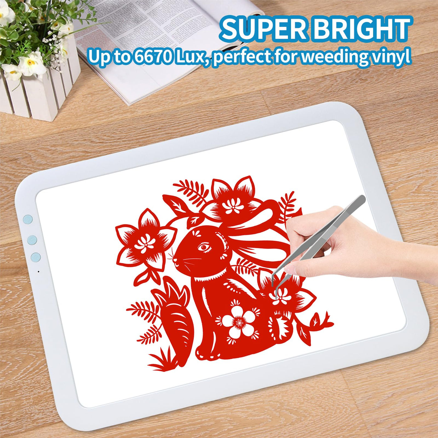 Toheto A3 Light Pad For Diamond Painting, Light Board, Tracing Light Box For Weeding Vinyl, Ultra-Thin Copy Board With 6 Levels And Stepless Adjustable Brightness For Drawing, Sketching, Animation. 1. 4.5-Hour Battery: With 3500Mah Rechargeable Lithium Battery, The Light Pad Can Work Continuously For 5 Hours Wirelessly. Convenient For You To Use It Anywhere In Your Home Or On Your Journey. Equipped With Upgraded Type C Cable, Easy To Access Any Type-C Port, Charging Is Fast And Efficient. 2. 6-Level/Stepless Brightness: Adjustable Brightness Up To 6600 Lux, You Can Freely Choose Proper Brightness According To Different Environments And Usage. The High Brightness Is Exclusively Designed For Weeding Vinyl, Clearly Illuminating The Hard-To-See Lines For Precision Weeding. 3. 3 Color Temperatures: There Are 3 Kinds Of Color Temperatures: Cold White, Regular White, And Warm Color. Perfect For Different Light Environments. Whether You Make Craftwork In A Sunny Day, Raining Day, Or In Dim Light, There Will Always Be A Color Mode To Meet Your Need And Also Protect Your Eyesight. 4. Brightness Memory: With An Intelligent Brightness Memory Function, Toheto Light Pad Will Always Remember Your Last Choice, No Need To Readjust! Sweet Tool For Diamond Painting, Weeding Vinyl, Htv Vinyl, Sketching, And Scrapbooking. Also An Excellent Birthday Gift For Children And Various Holiday Gifts 5. Portable And Durable: A3 Size (41.4*31*8 Cm). Made Of High Strength Panel, The Board Is More Scratch And Cut Resistant. It Will Not Easily Leave Scratches For Ordinary Diamond Painting Or Weeding Vinyl Work. Always Keep A Smooth Surface And Got Longer Service Life.
