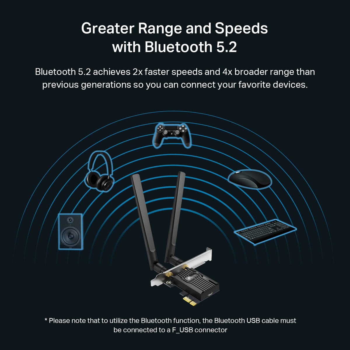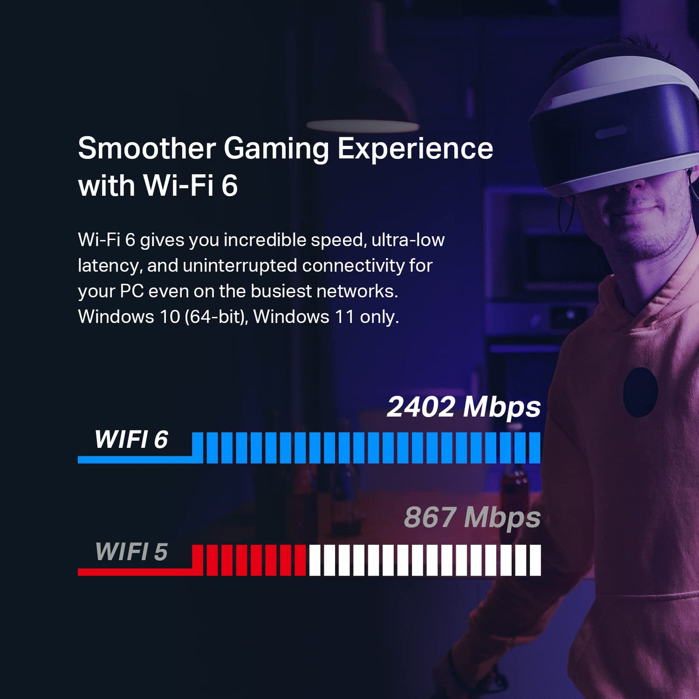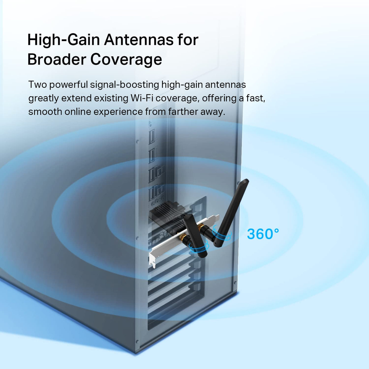 Introducing the TP-Link AX3000 Wi-Fi 6 Bluetooth 5.2 PCIe Adapter - the ultimate solution for high-performance connectivity tailored to meet the demands of gamers and tech enthusiasts alike. Experience the very latest in Wi-Fi technology with Wi-Fi 6, delivering extreme speeds, ultra-low latency, and uninterrupted connectivity. Whether you're downloading large files, streaming high-definition content, or engaging in immersive gaming experiences, the TP-Link AX3000 ensures faster downloads and seamless performance.
