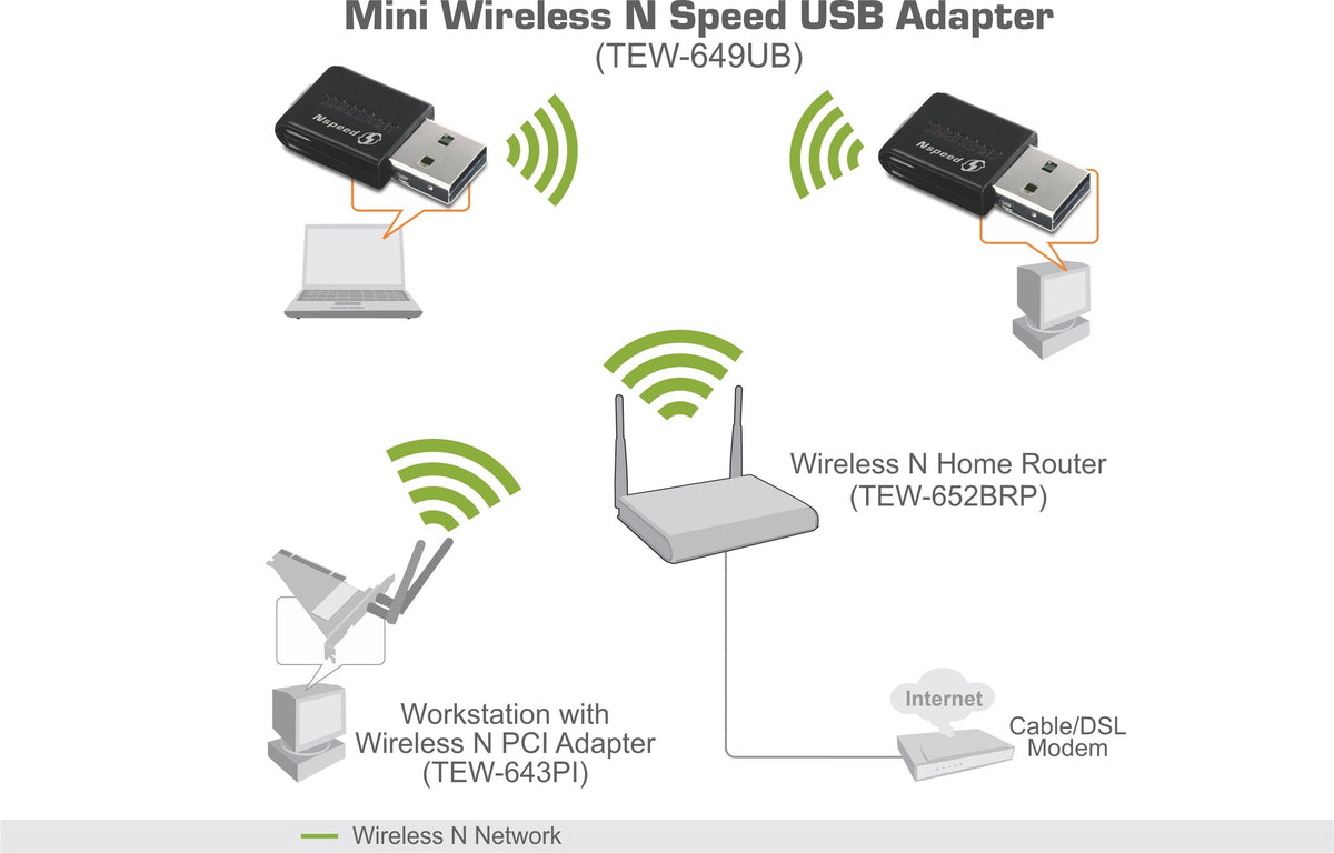 From The Manufacturertew-649Ub Mini Wireless N Speed Usb Adapterthe Mini Wireless N Speed Usb Adapter (Model Tew-649Ub) Connects A Laptop Or Desktop Computer To A Wireless N Network At Up To 8X The Speed And 4X The Coverage Of A Wireless G Connection.Enjoy Proven Wireless N Speed And Reliability In An Ultra Compact Design That Is Slightly Larger Than A Us Penny.Setup Is A Breeze With One-Touch Wi-Fi Protected Setup (Wps) Technology. Advanced Wireless Encryption Protects Your Valuable Data. Mimo Antenna Technology Delivers Superior Range And Eliminates Dead Spots. Wi-Fi Multimedia (Wmm) Quality Of Service (Qos) Prioritizes Important Video, Audio And Gaming Traffic. Stream Video, Download Files, Play Games And Talk Online With This Ultra Compact Adapter. Overview - Tew-649Ub Ultra Compact High Speed Wireless N Adapter Upgrade Your Laptop Or Desktop To Wireless N 8X The Speed And 4X The Coverage Of Wireless G Technology One-Touch Setup With Wi-Fi Protected Setup (Wps)Hardware: Usb 2.0 Connector Compatible With Ieee 802.11A/B/G/N Standards Two High Performance Internal Antennaswireless: Multiple Input Multiple Output (Mimo) Antenna Technology Wi-Fi Multimedia (Wmm) Quality Of Service (Qos) Data Prioritization Supports Ad-Hoc Or Infrastructure Mode Networking Solution Enlargetrendnet Usb Adapter Comparison Chart Model Tew-684Ub Tew-664Ub Tew-624Ub Tew-649Ub Tew-648Ub Product Title N900 Dual Band Wireless Usb Adapter N600 Wireless Dual Band Usb Adapter N300 Mini Wireless Usb Adapter Mini Wireless N Speed Usb Adapter 150Mbps Mini Wireless N Usb Adapter Characteristicswi-Fi Bands2.4Ghz And 5Ghz2.4Ghz And 5Ghz2.4Ghz2.4Ghz2.4Ghzupload450Mbps300Mbps300Mbps150Mbps150Mbpsdownload450Mbps300Mbps300Mbps300Mbps150Mbpsexternal Wi-Fi Protectedsetup (Wps) Button?????Wps Support?????Securitywpa2-Pskwpa2-Pskwpa2-Pskwpa2-Pskwpa2-Pskpackage Contents: Tew-649Ub Cd-Rom (Utility And Driver) Multi-Language Quick Installation Guideproduct Descriptiontrendnet Tew-649Ub (Version V1.0R) 300Mbps Mini Wireless N Speed Usb2.0 Adapter
