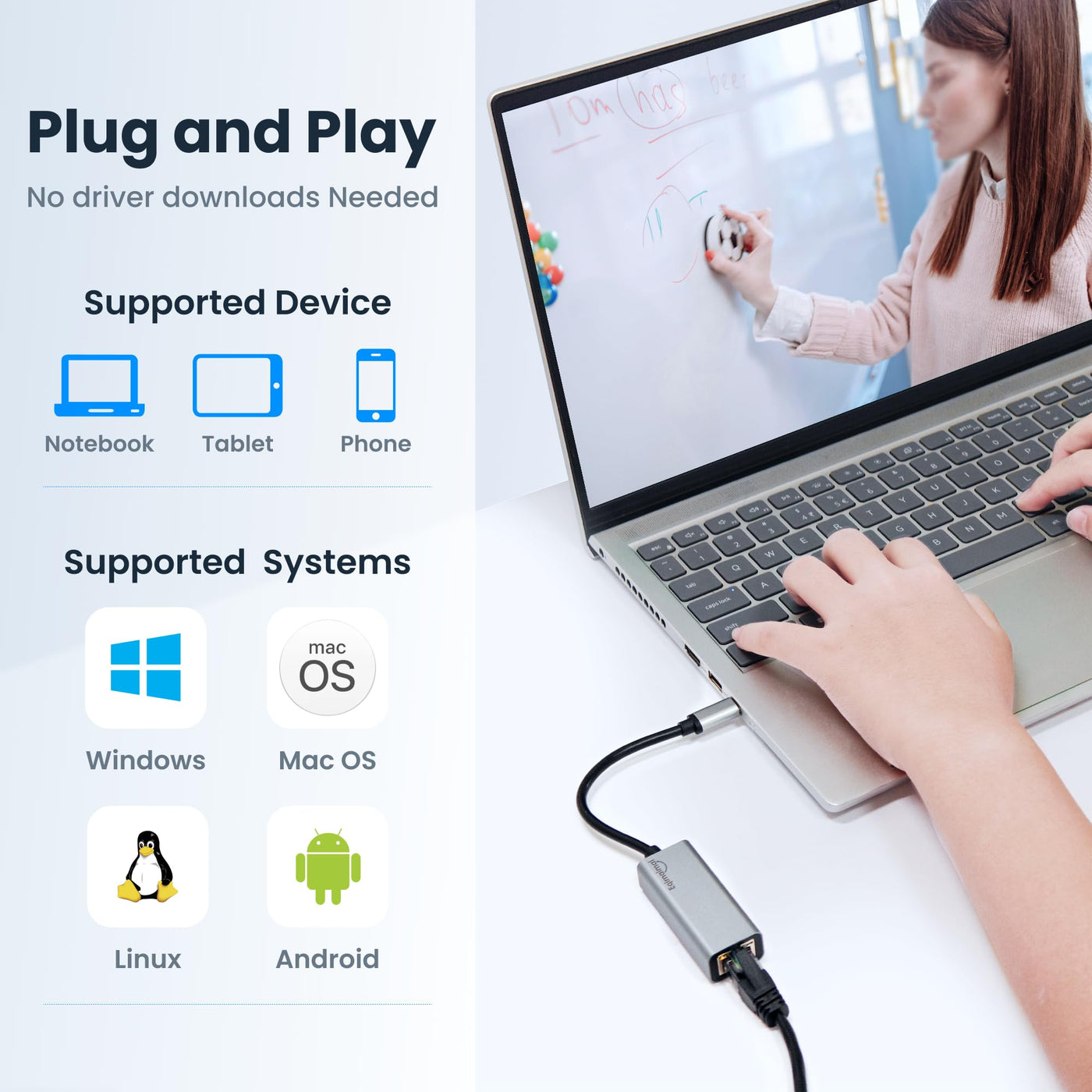 Q: Is any additional software needed to use the adapter?A: No additional drivers or software are required to use the USB-C to Ethernet Adapter. It features plug-and-play functionality, making it easy to set up with various operating systems, including Windows 11/10/8.1/8, macOS, iPad OS, Chrome OS, Linux, and Android.