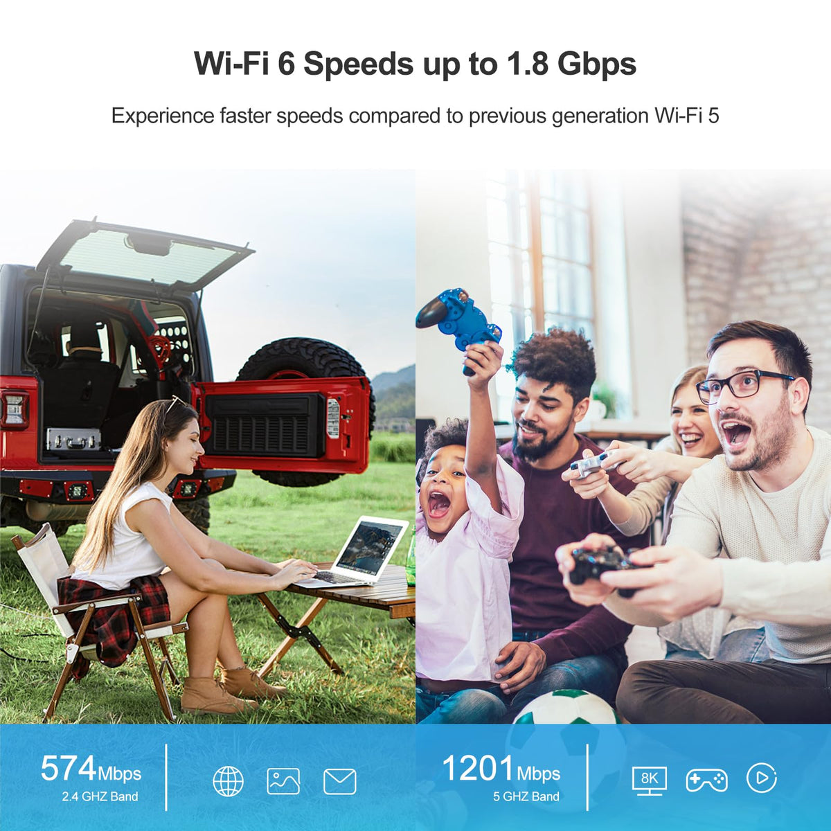 Q: What is the maximum speed of the USB WiFi 6 Adapter?A: The USB WiFi 6 Adapter can reach speeds of up to 1800 Mbps, with 574 Mbps on the 2.4 GHz band and 1201 Mbps on the 5 GHz band, making it ideal for gaming and streaming high-definition content.