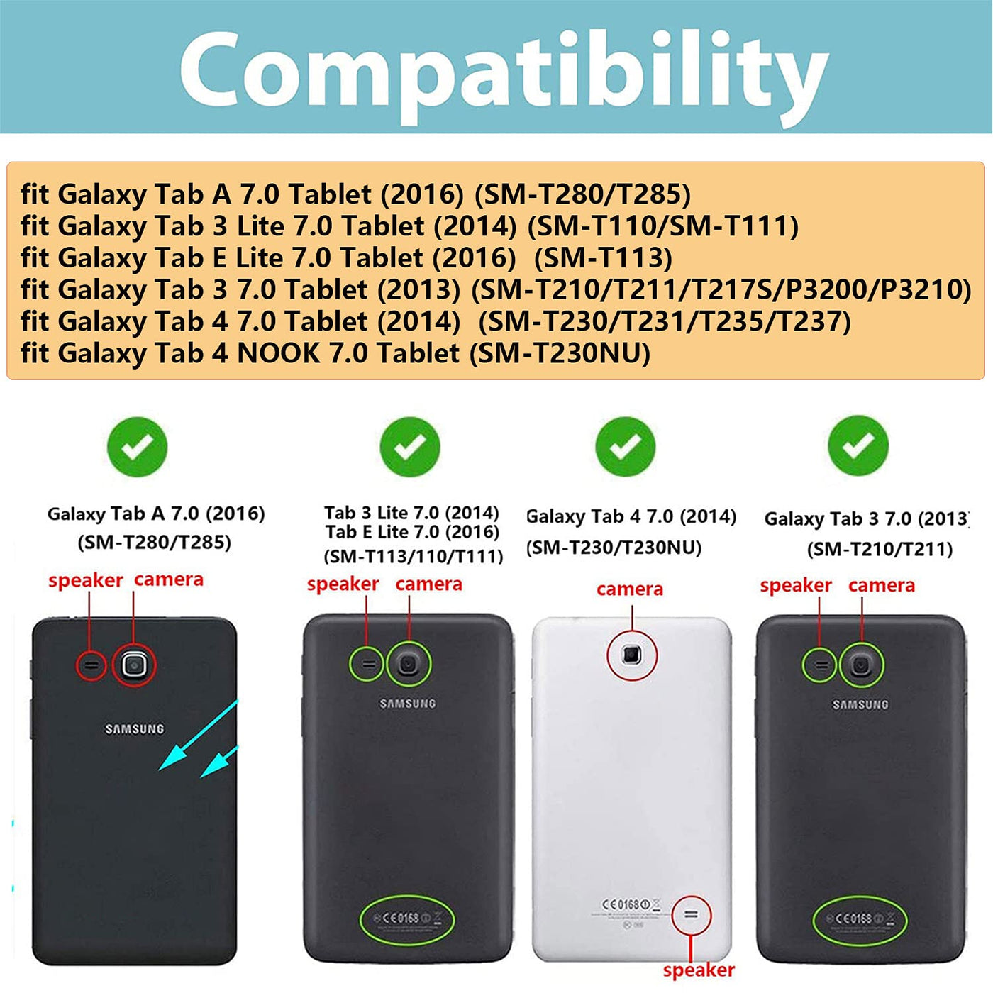 Find The Model That Fits Your Tablet: Compatible With Samsung Galaxy Tab A 7.0 (T280/T285) (2016 Release); 7 Inch Compatible With Samsung Galaxy Tab 4 7.0 (T230 /T231/ T235) (2014 Release); 7 Inch Compatible With Samsung Galaxy Tab 3 7.0 Inch (Sm-T210/Sm-T211 P3200 P3210 ) (2013 Release); 7 Inch Compatible With Samsung Galaxy Tab E Lite 7.0 (Sm-T113) (2016 Release) Compatible With Samsung Galaxy Tab 3 Lite 7.0 (Sm-T110/Sm-T111/Sm-T116) (2014 Release), 7 Inch Not Compatible With Other Tablet Models. Uucovers Product Features: 1. Material: High Quality And Durable Eva Foam Material With Rugged Silicone & Rubber Frame Surface. Provides Extra Shock-Absorbing, Skid-Proof And Anti-Scratch Protection. 2. Kickstand: 2 Built-In Foldable Kickstands Can Stand Up Your Tablet On The Desk For Hands-Free Horizontal Viewing Angle Or Typing Position. 3. Handle: Anti-Slip Handle Is Designed For Comfortable One Handed Grip, The Handle Is Friendly To Kids And They Can Grip The Handle And Carry The Case Easily. 4. Cut-Outs: Precise Cut-Outs For Buttons, Ports And Cameras, Easy Access To All Features Without Removing The Slim Case. 5. Slim And Lightweight :The Raised Bezel On The Front Cover Provides Protection For Your Screen, Not Too Bulky, Doesn'T Add Much Weight. 6. Easy To Clean: Drop-Proof And Impact Resistant Case Is Washable; A Good Gift For Your Child, Boys, Girls, Women, Men, Business, School,Ect. Package Includes: 1. A Case: Uucovers Galaxy Tab 3/Tab 4/Tab A 7.0 & Tab 3/Tab E Lite 7.0 Protective Case (Sm-T230/T235/T280/T113/T110/T111/P320/T210 T211) Shockproof Cover 2. Gift: A Stylus Pen And Cleaning Cloth