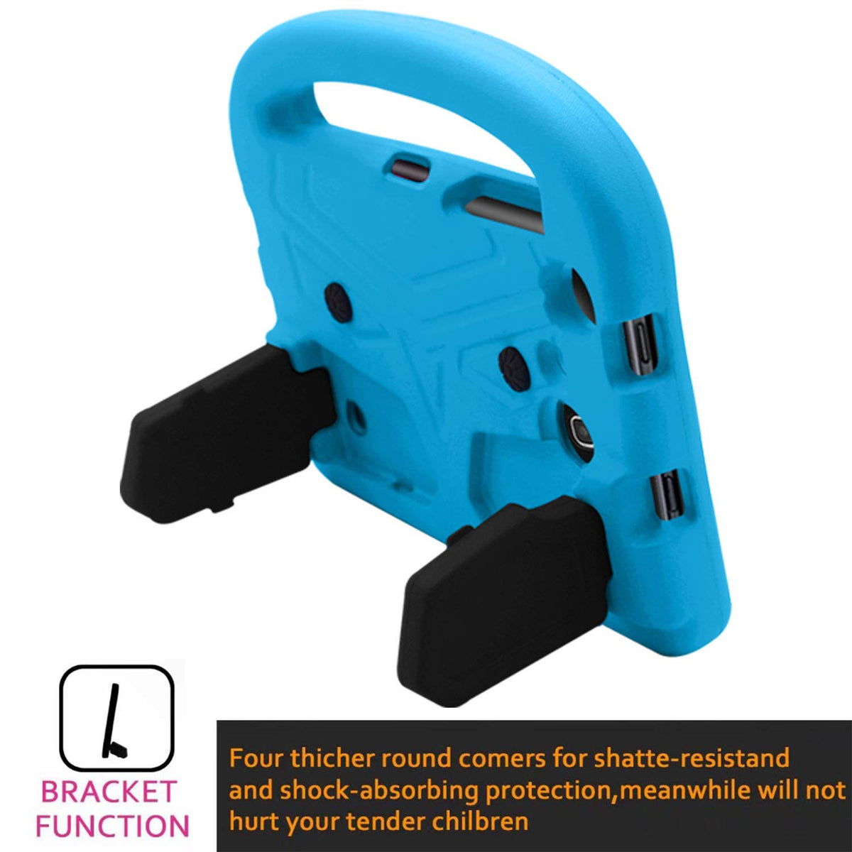 Q: How does the kickstand functionality work on this case?A: The UUcovers Kids Case features two fun, foldable kickstands on the back that can be easily unfolded to hold your tablet in a stable position. This allows for hands-free viewing in both video mode and typing mode, making it ideal for entertainment and productivity.