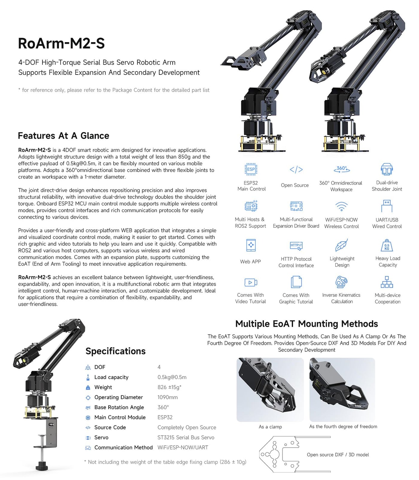 ??Rich Graphic And Video Tutorials?Provides A User-Friendly And Cross-Platform Web Application That Integrates A Simple And Visualized Coordinate Control Mode, Making It Easier To Get Started. Comes With Rich Graphic And Video Tutorials To Help You Learn And Use It Quickly. Compatible With Ros2 And Various Host Computers,Supports Various Wireless And Wired Communication Modes. | ??Meet Innovative Requirements?Comes With An Expansion Plate, Supports Customizing The Eoat (End Of Arm Tooling) To Meet Innovative Application Requirements.Completely Open Source For The Control Codes And Communication Interface Documents Of Roarm-M2-S, Supports Multiple Languages And Devices For Secondary Development. | ??Multiple Wirelesss Control Modes? Onboard Esp32 Mcu Main Control Module Supports Multiple Wireless Control Modes, Provides Control Interfaces And Rich Communication Protocols For Easily Connecting To Various Devices. | ??360