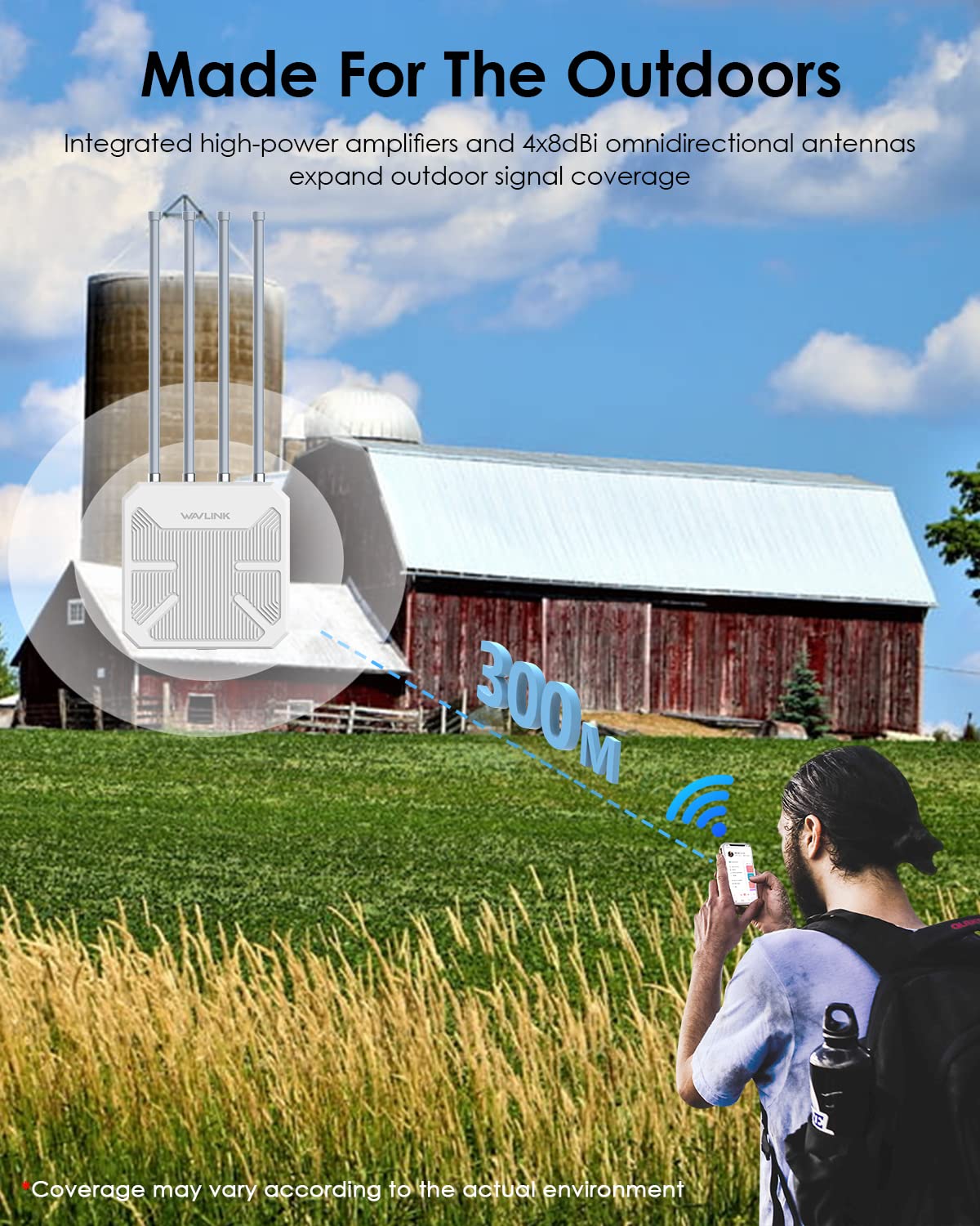Wavlink Professional Outdoor Router/Ap/Repeater, Enjoy Super-Speed Wifi6 Anytime & Anywhere Wn573Hx1 Is A High-Performance Outdoor Router/Ap/Repeater Specially Designed For Outdoor Use: Robust Weatherproof Case And 15Kv Esd Protection Ensure Continuous Operation And Stable Connection Under Harsh Outdoor Conditions; The 4 X 8Dbi Omnidirectional Glass Tube Antennas Feature High Strength And High Precision, A Long Service Life And Excellent Wireless Performance; Supports Ieee 802.11 Ax/Ac/A/N/G/B Standards, And Provides Blazing-Fast Internet Speeds Of 1800Mbps (2.4Ghz 574Mbps+5Ghz 1201Mbps); Supports Mu-Mimo And Beamforming Technology, Allowing Up To 128 Devices To Be Connected Simultaneously In A Wider Range.