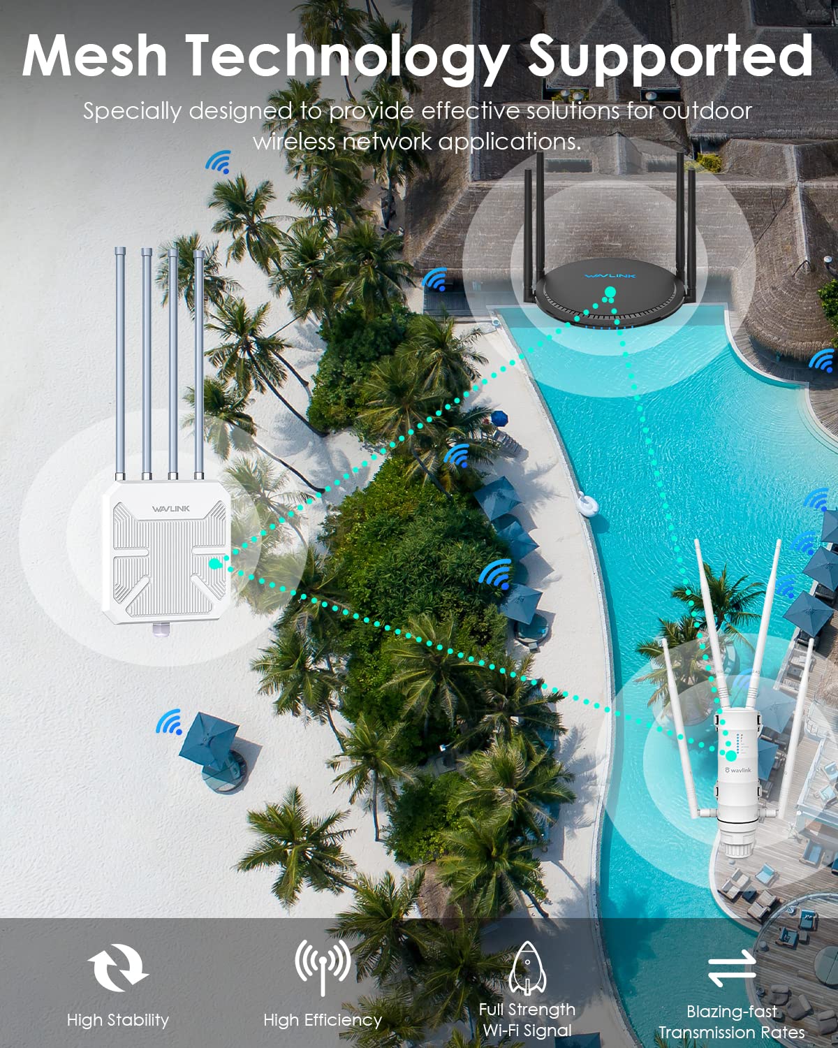 Q: What is the maximum WiFi speed of the WAVLINK AX1800 Outdoor WiFi Extender?A: The WAVLINK AX1800 Outdoor WiFi Extender supports dual-band maximum speeds of up to 1201Mbps on the 5GHz band and 574Mbps on the 2.4GHz band, providing a total speed of 1800Mbps for a fast and reliable internet connection.